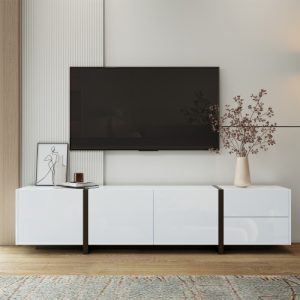 TV Cabinet, White High-gloss Cabinet And Black Contrasting Table Legs, With Simple Cabinet Doors And Drawers.