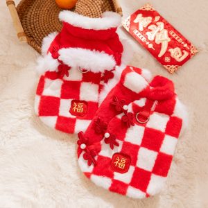 Chinese New Year Checkered Pet Vest With Luck Symbol, Plush Red White Dog Jacket With Qipao Knots For Lunar New Year