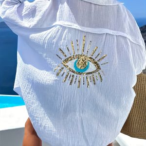 Women’s Oversized Button-Down Shirt With Sparkling Eye Print On Back Long Sleeve Blouse For Spring And Fall