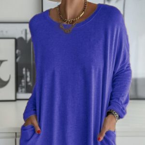Spring And Summer New Round Neck Long Sleeve Loose Pockets Solid Color