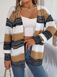 Women Casual Color Block Stripe Lantern Sleeve Cardigan Sweater Coat