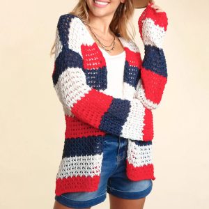 Long-sleeved Knitted Hollow-out Contrast-color Sweater Jacket