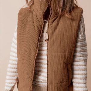 Coffee Corduroy Stand Neck Zipped Puffer Vest