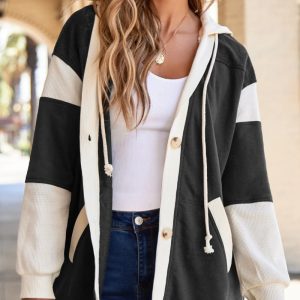 Black Waffle Contrast Color Knitted Stitching Button Front Cardigan Oversized Hoodie