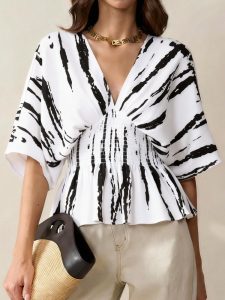 V-neck Bow-knot Loose-fit Three-quarter Sleeve Womens Top