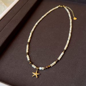 Titanium Steel Starfish Pendant Necklace Natural Shell Tigereye