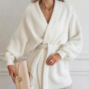 V-neck Long Sleeve Lace-up Loose Casual Mid-length Plush Coat