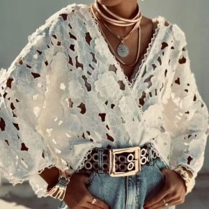 Elegant Three-dimensional Lace Flower V-neck Hollow Long Sleeve