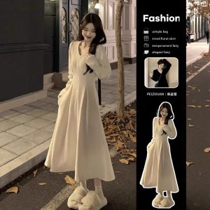 Elegant Style Detachable Long Sleeve V-neck Black Knitted Dress