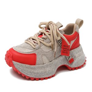 Shiny Sequin Women’s High-top Sneakers With Thick Soles, Lace-up Fashion Shoes Featuring Silver And Red Rhinestone Design