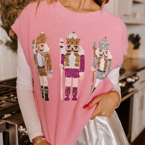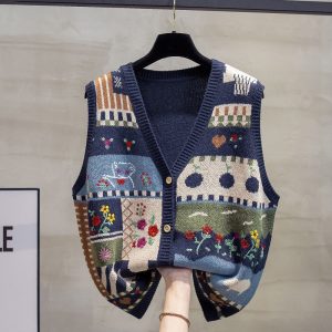 Women’s Casual Round Neck Stitching Printing Knitted Vest