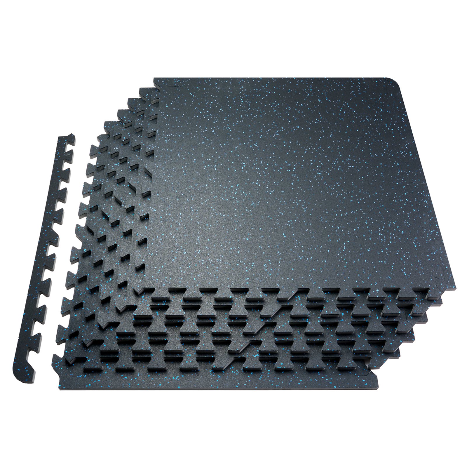 These 0.56 inch thick gym floor mats feature 25 interlocking tiles, each measuring 25 inches by 25 inches, providing a total coverage of 100 square feet. The mats combine a durable rubber top layer with an EVA foam base, delivering excellent cushioning and impact absorption for workout areas. Designed for versatility, they are suitable for use in gyms, home fitness rooms, or garages. The interlocking puzzle design ensures secure assembly and easy customization of the workout space. The mats come in a black and blue color scheme, enhancing the aesthetic of any fitness environment while protecting floors from damage and reducing noise.