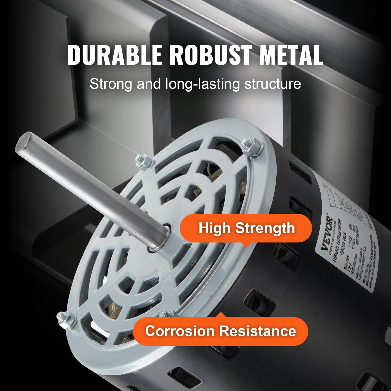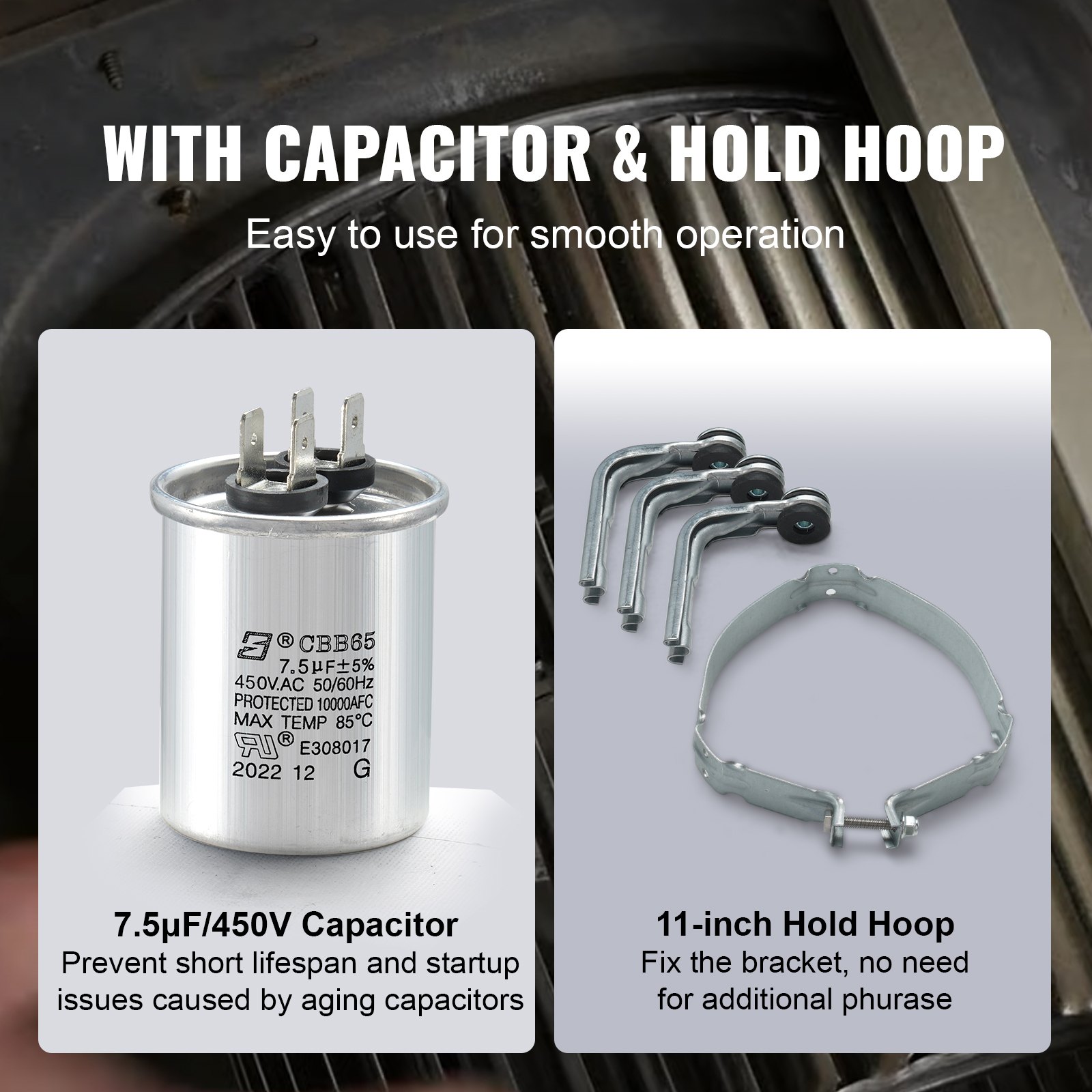Durable 1/2HP furnace blower motor with 5 speeds, 208/230V, 1075RPM, CW/CCW rotation, 48 frame, and included capacitor & hold hoop.
