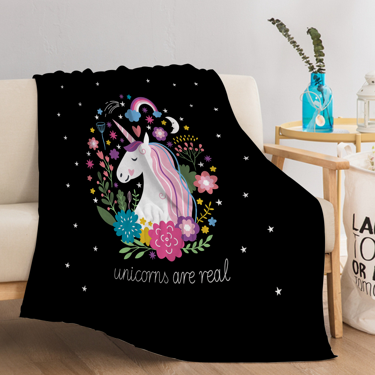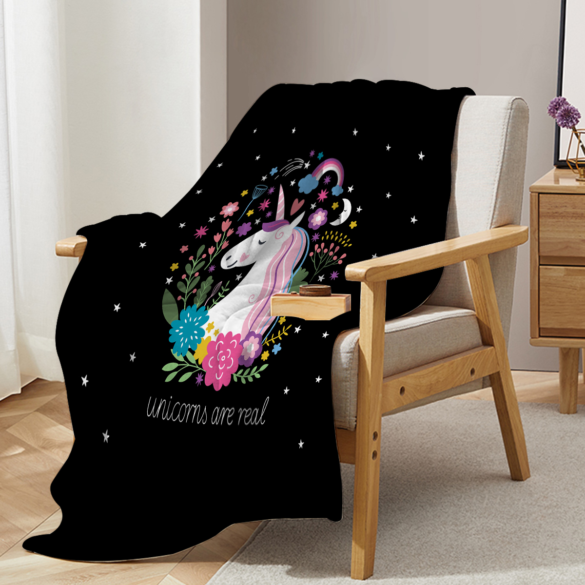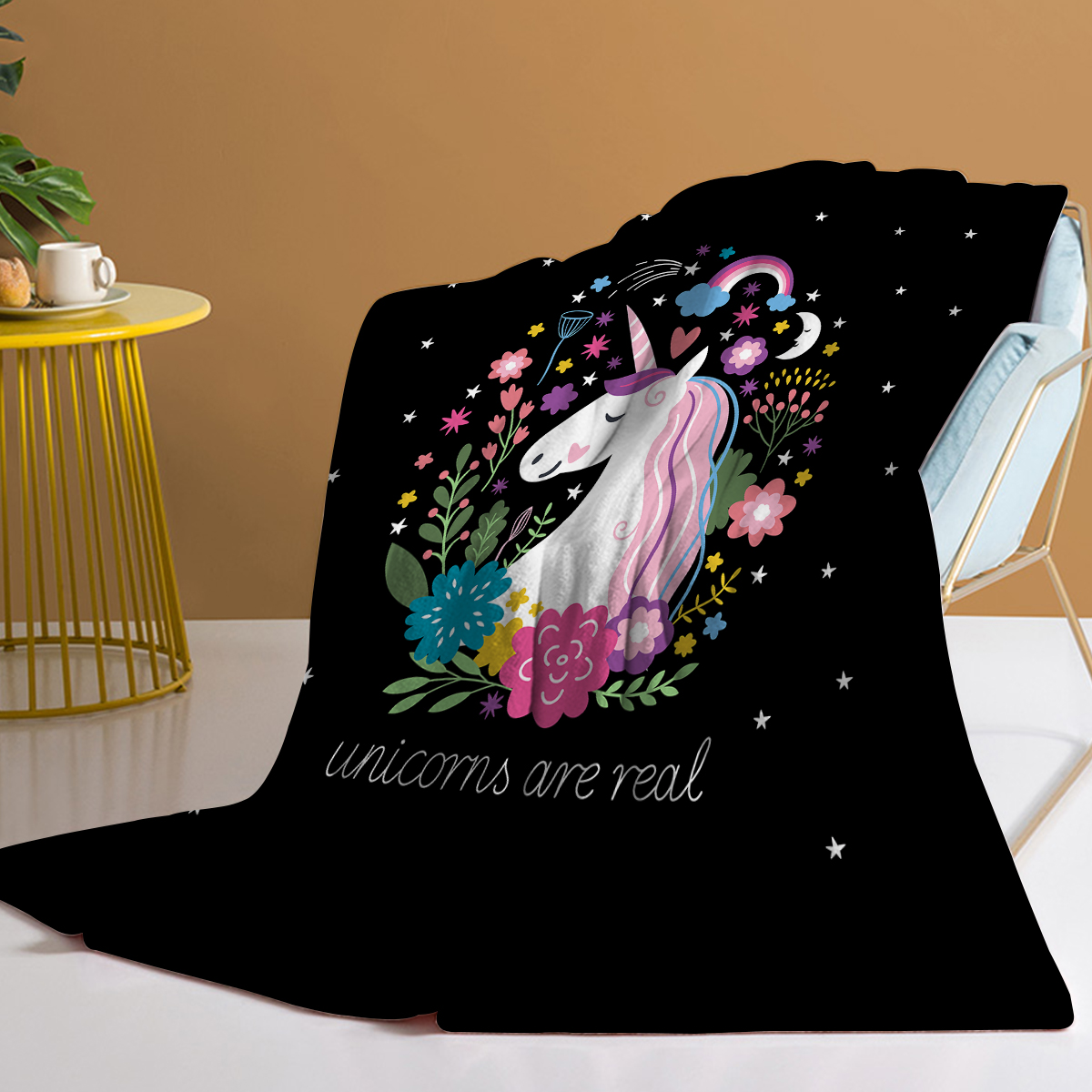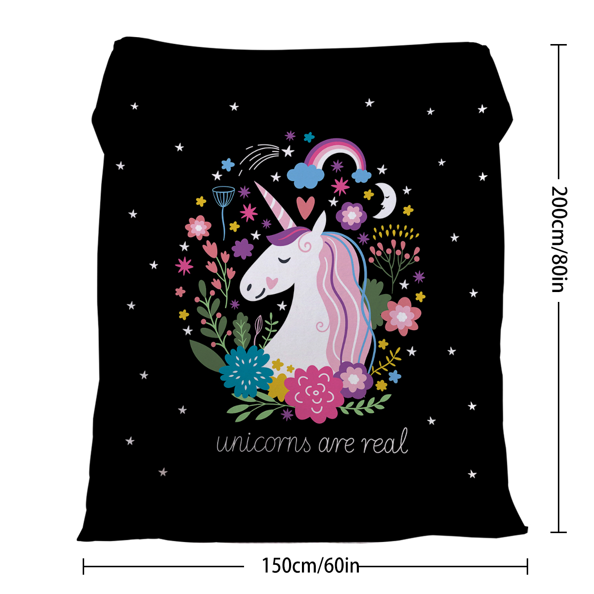 This black flannel blanket features a charming unicorn pattern and is crafted from soft, plush material for exceptional comfort. Designed to be lightweight yet warm, it serves multiple purposes including outdoor activities, beach outings, camping trips, living room throws, office naps, and sofa covers. The blanket’s soft texture and vibrant print make it both functional and visually appealing, enhancing any environment where extra warmth or decoration is desired.