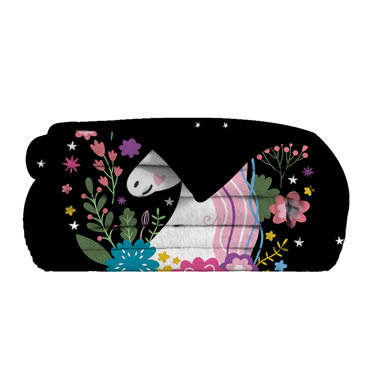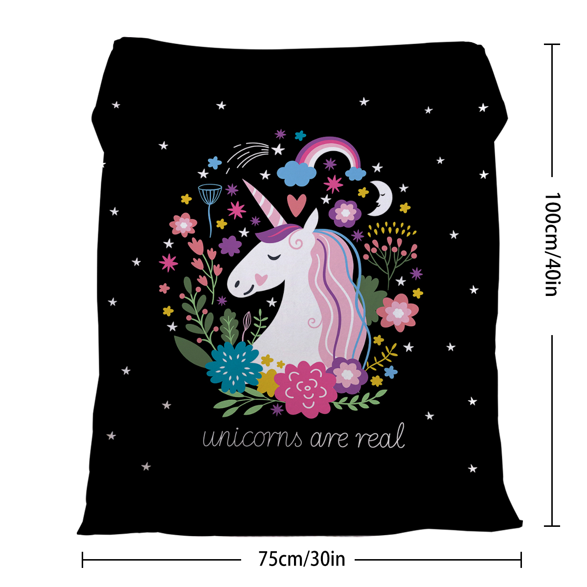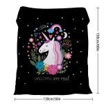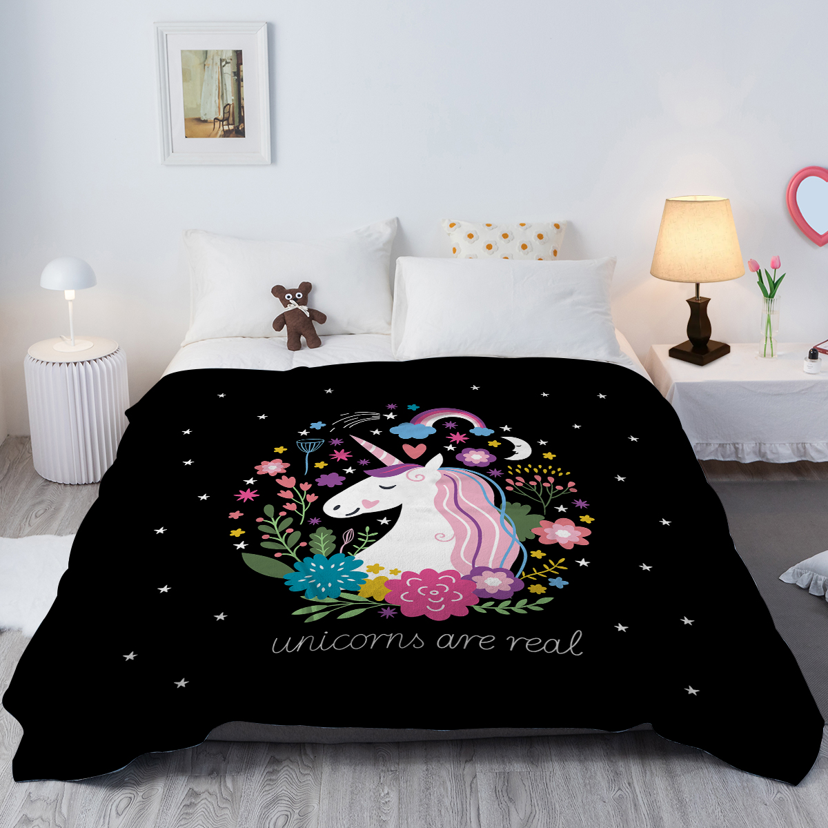This black flannel blanket features a charming unicorn pattern and is crafted from soft, plush material for exceptional comfort. Designed to be lightweight yet warm, it serves multiple purposes including outdoor activities, beach outings, camping trips, living room throws, office naps, and sofa covers. The blanket’s soft texture and vibrant print make it both functional and visually appealing, enhancing any environment where extra warmth or decoration is desired.