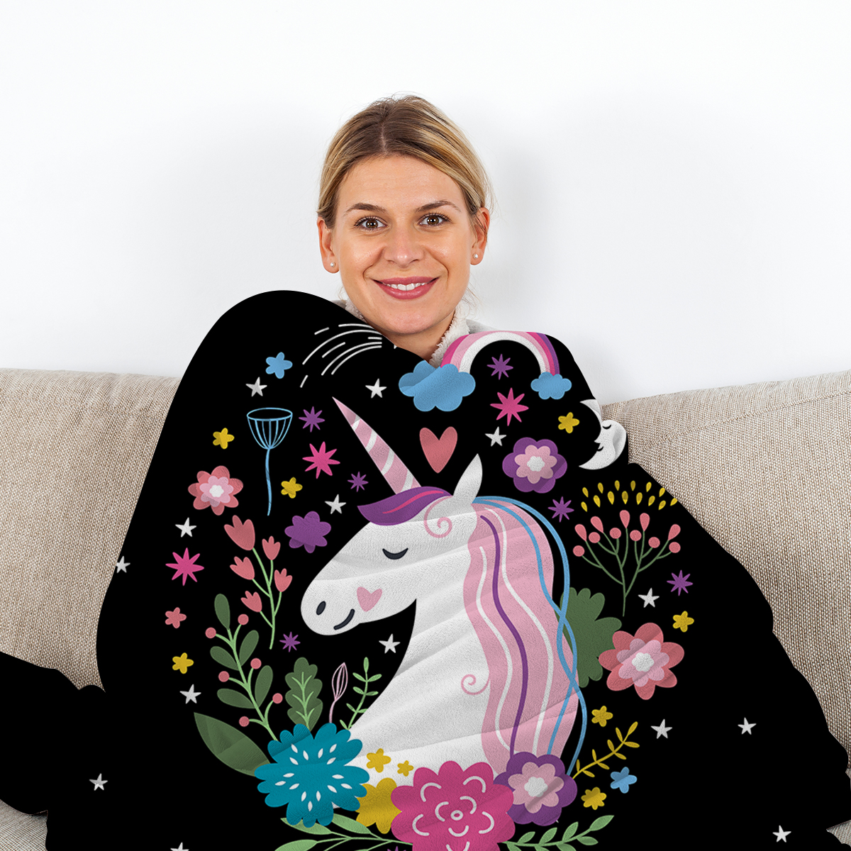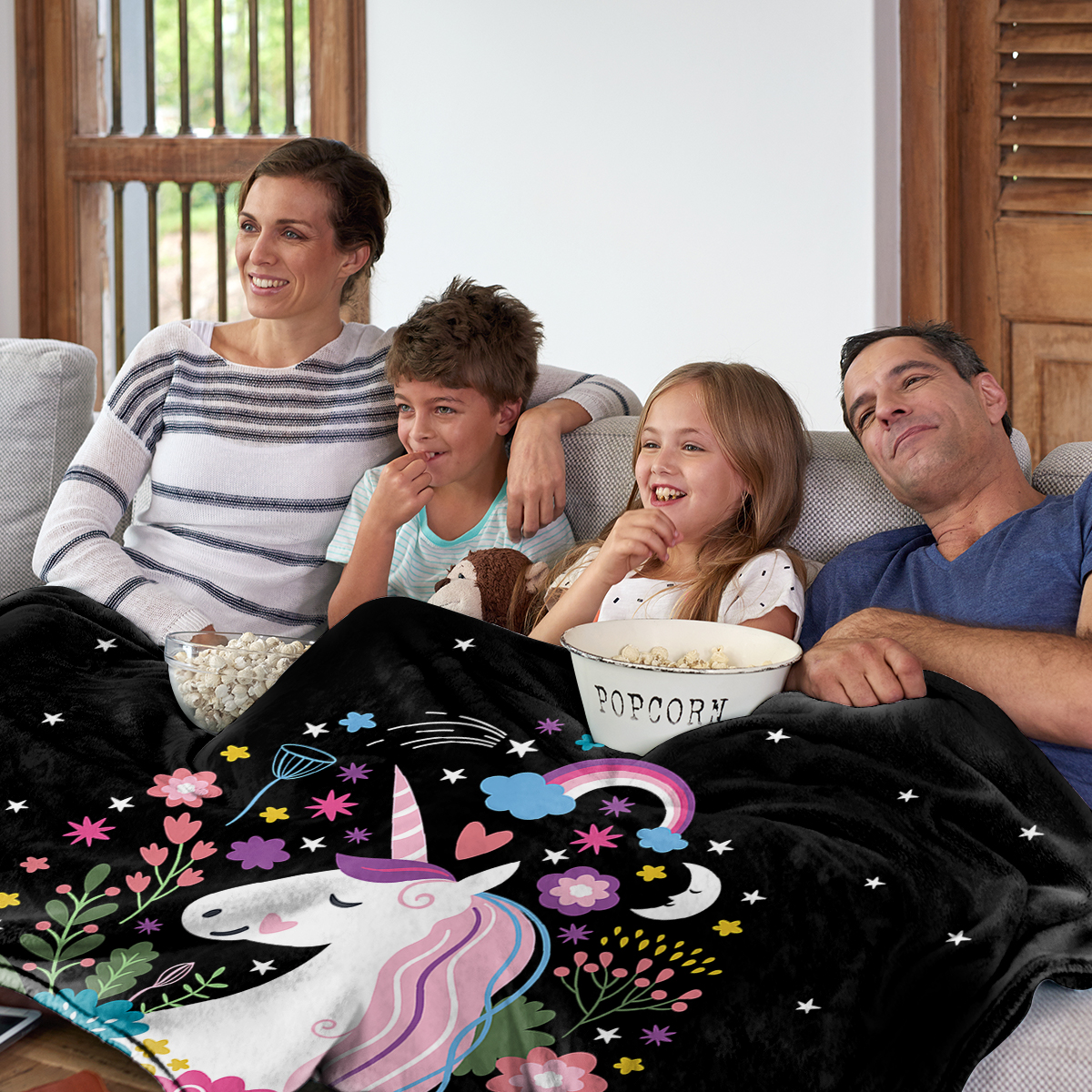 Cozy black flannel blanket with unicorn design, ideal for outdoor, beach, camping, living room or office use.