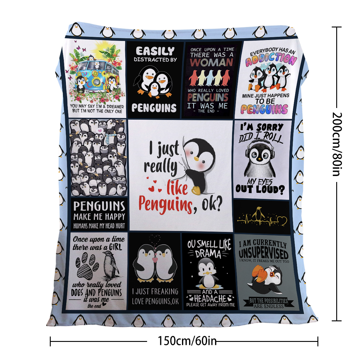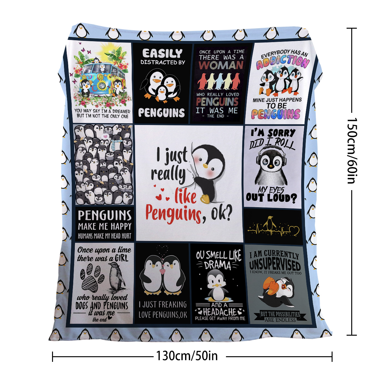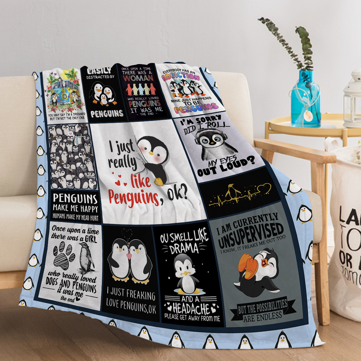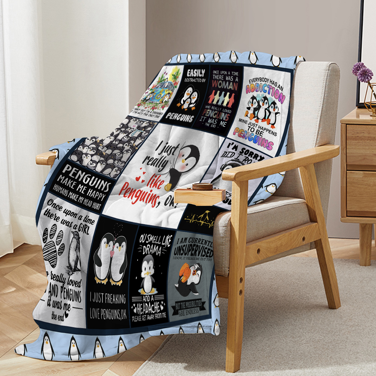 Cozy flannel blanket featuring various penguin designs, perfect for outdoor adventures or indoor relaxation on sofas and offices.