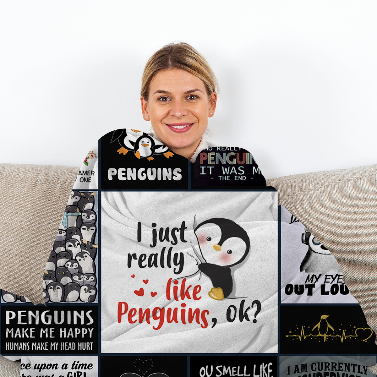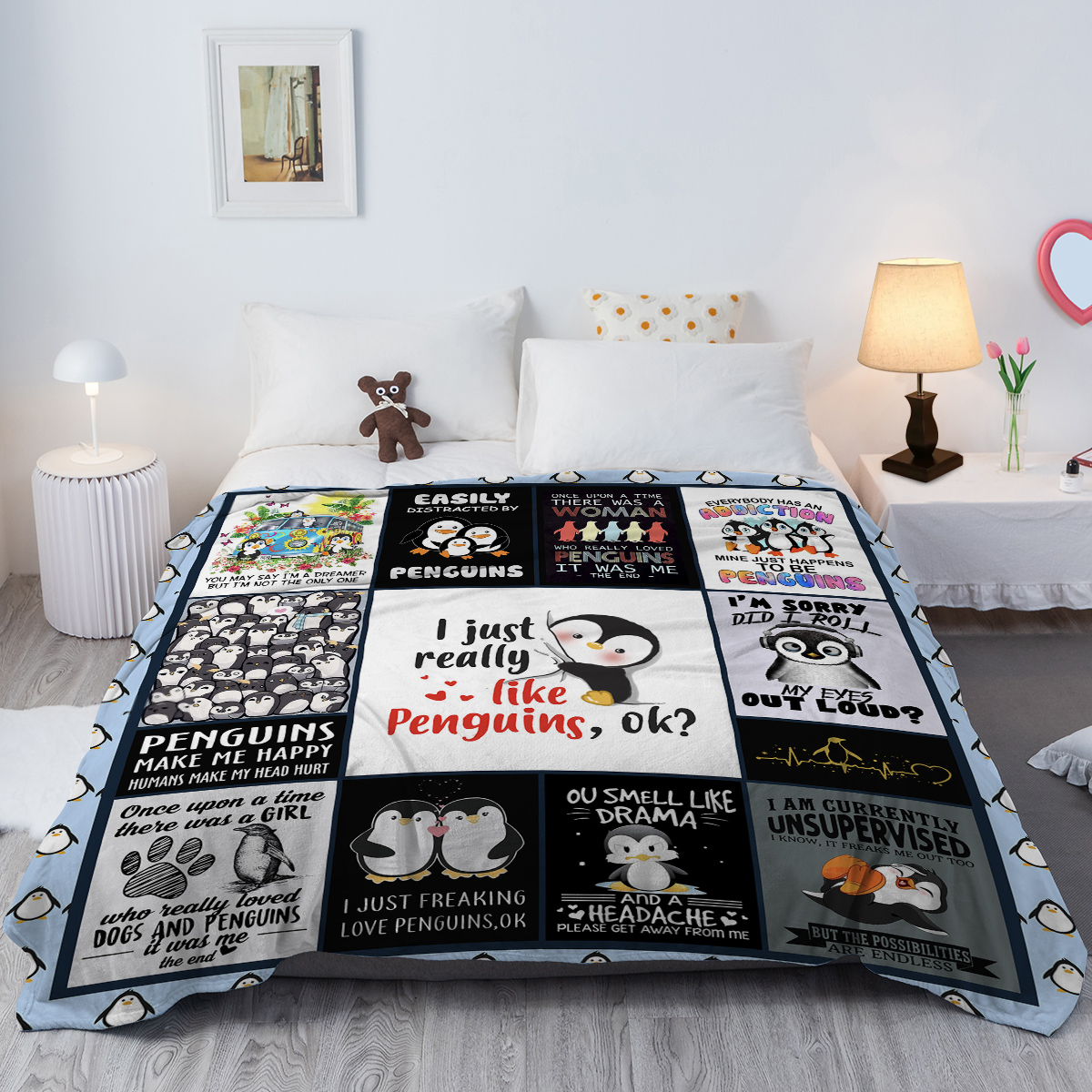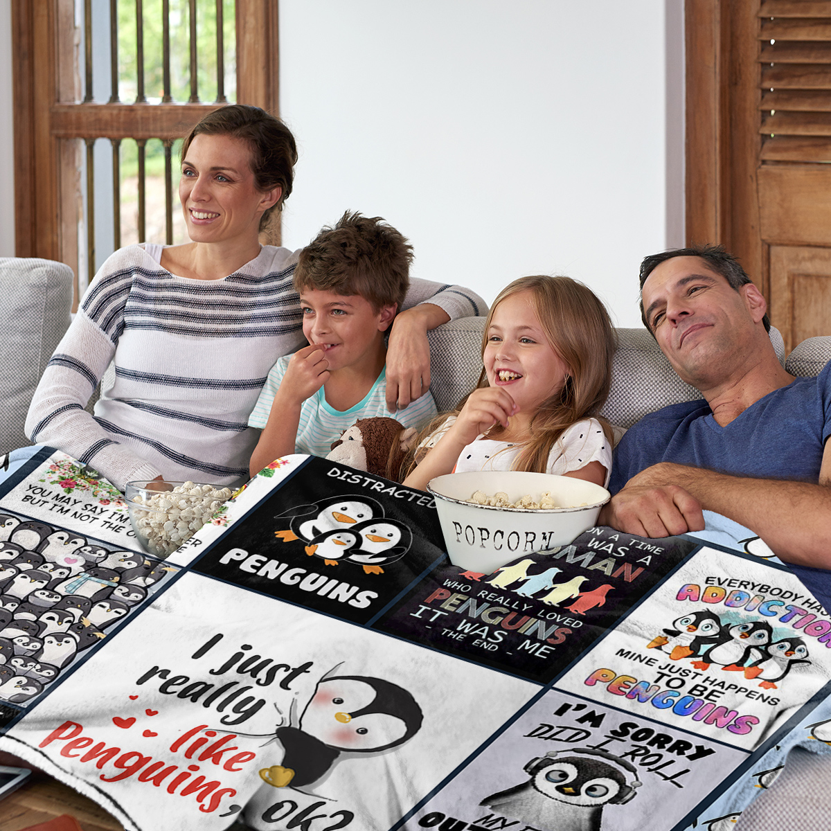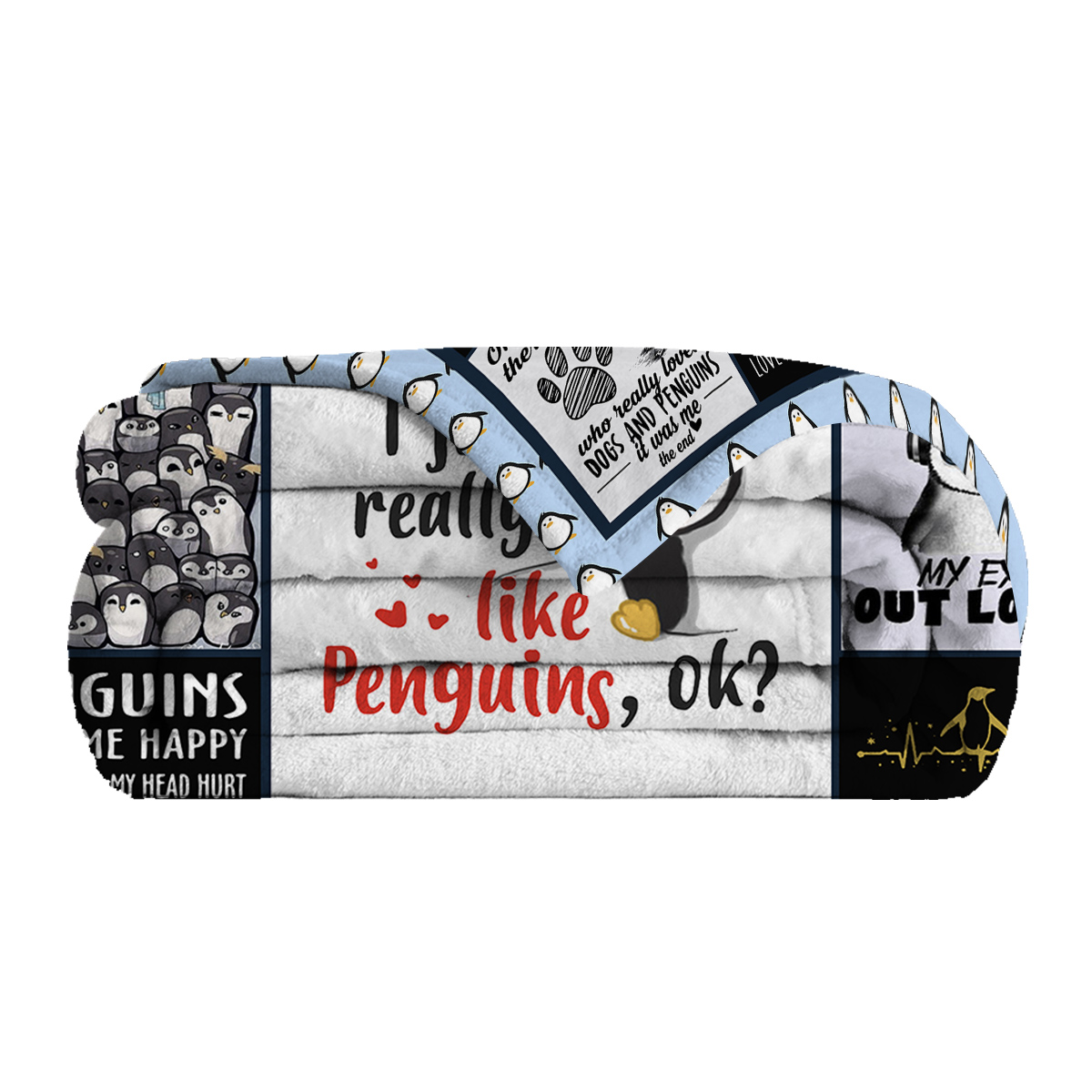 Cozy flannel blanket featuring various penguin designs, perfect for outdoor adventures or indoor relaxation on sofas and offices.