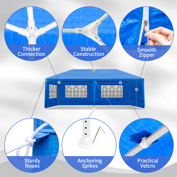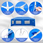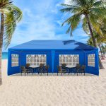 Durable 10’x20′ outdoor party tent with waterproof canopy and 6 removable sidewalls, ideal for weddings, patios, and events. Blue gazebo tent.