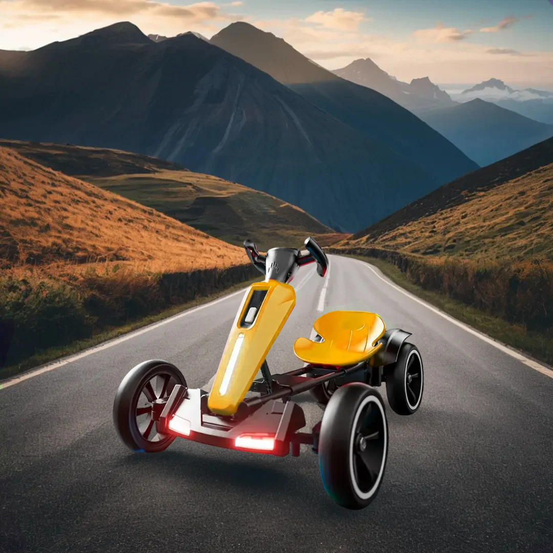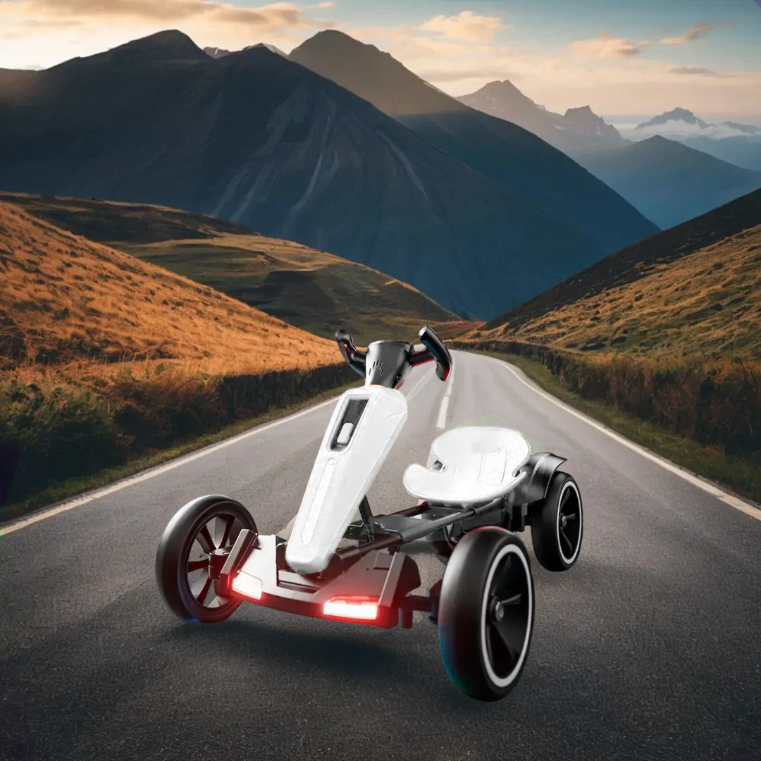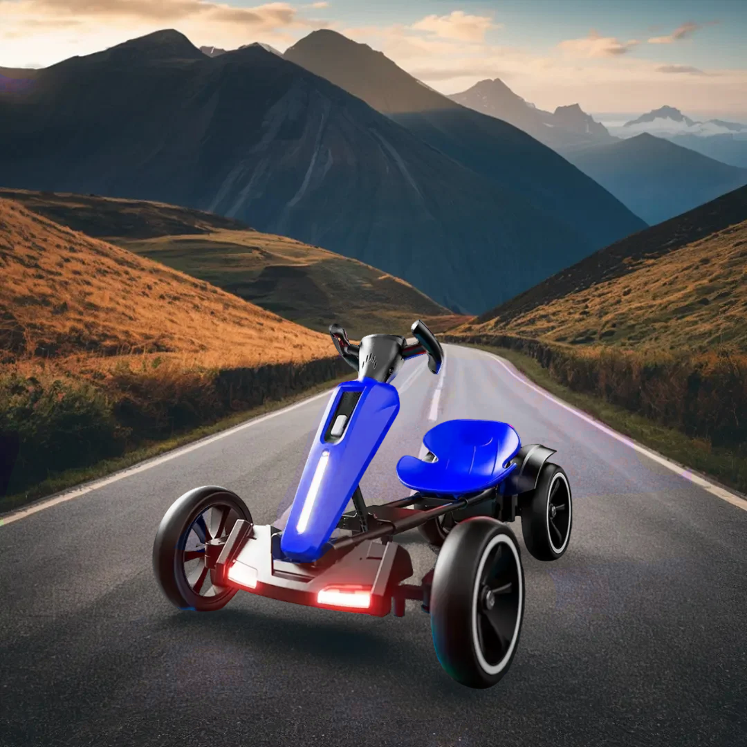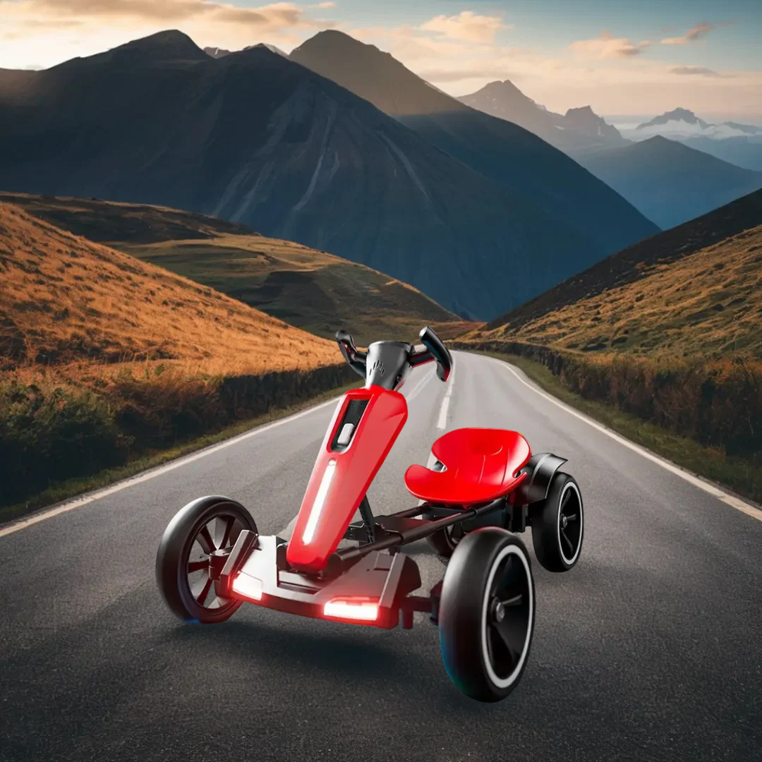 Electric kids pedal go kart with foldable design, adjustable seat, and four non-slip EVA wheels for ages 3-8. Ideal outdoor ride-on toy for boys and girls.