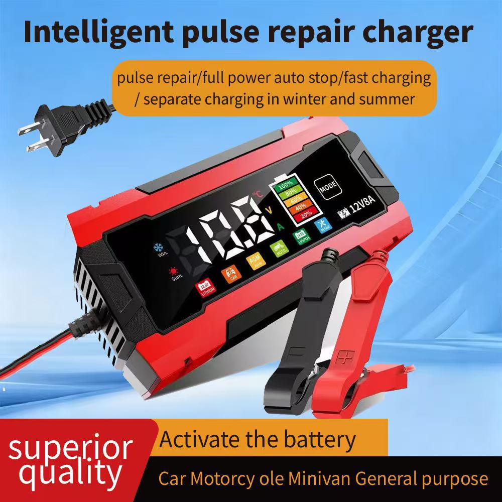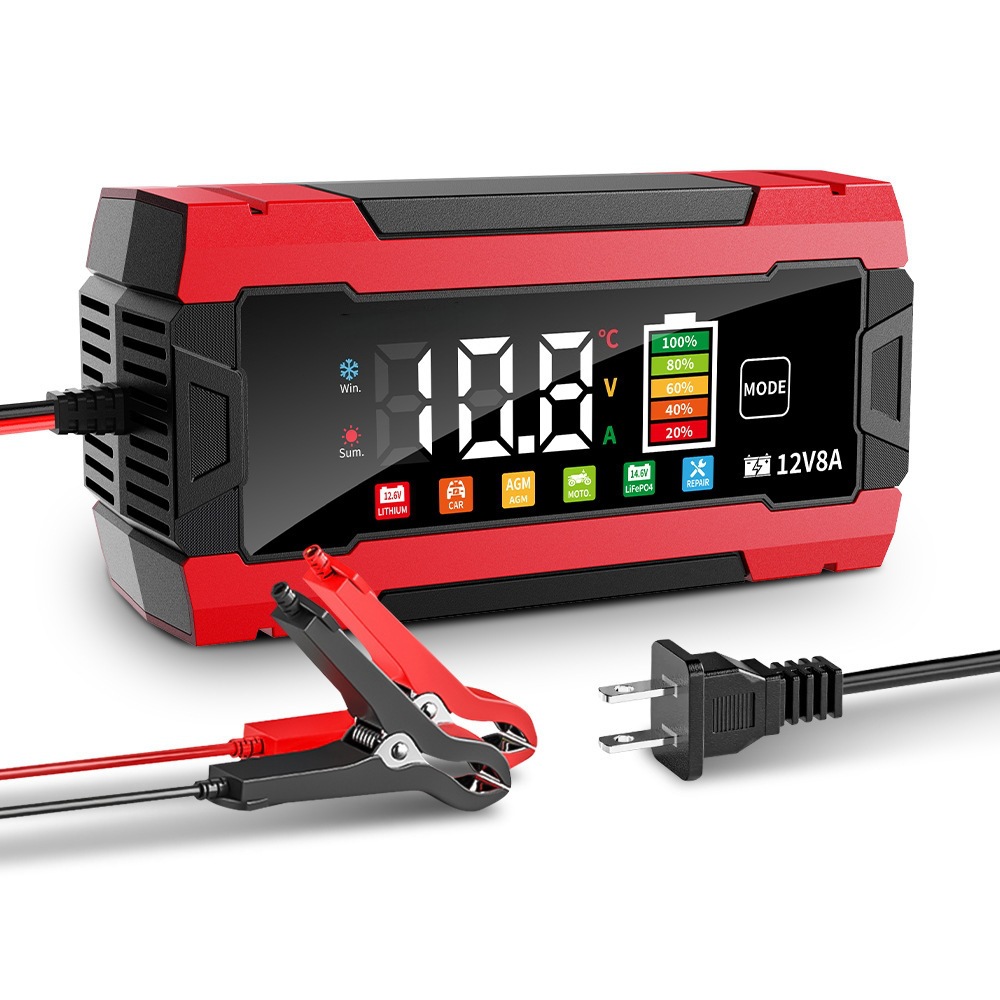 Efficient 12V 8A battery charger with color display, designed for car and motorcycle storage batteries.