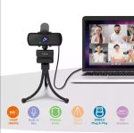 High-definition 1440p PC webcam featuring an integrated microphone and tripod for clear video calls and stable positioning.