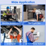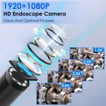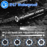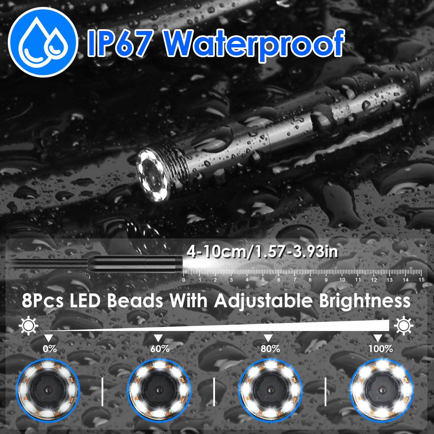 This 1080P endoscope camera features an 8mm diameter lens equipped with 8 adjustable LED lights for enhanced visibility in dark or confined spaces. It includes a 4.3-inch colorful display providing clear, real-time images for detailed inspections. The semi-rigid 16.4ft cable allows flexible maneuvering through narrow and hard-to-reach areas. Designed with an IP67 waterproof rating, this handheld borescope is suitable for various applications, offering durability and reliable performance in wet or dusty environments.