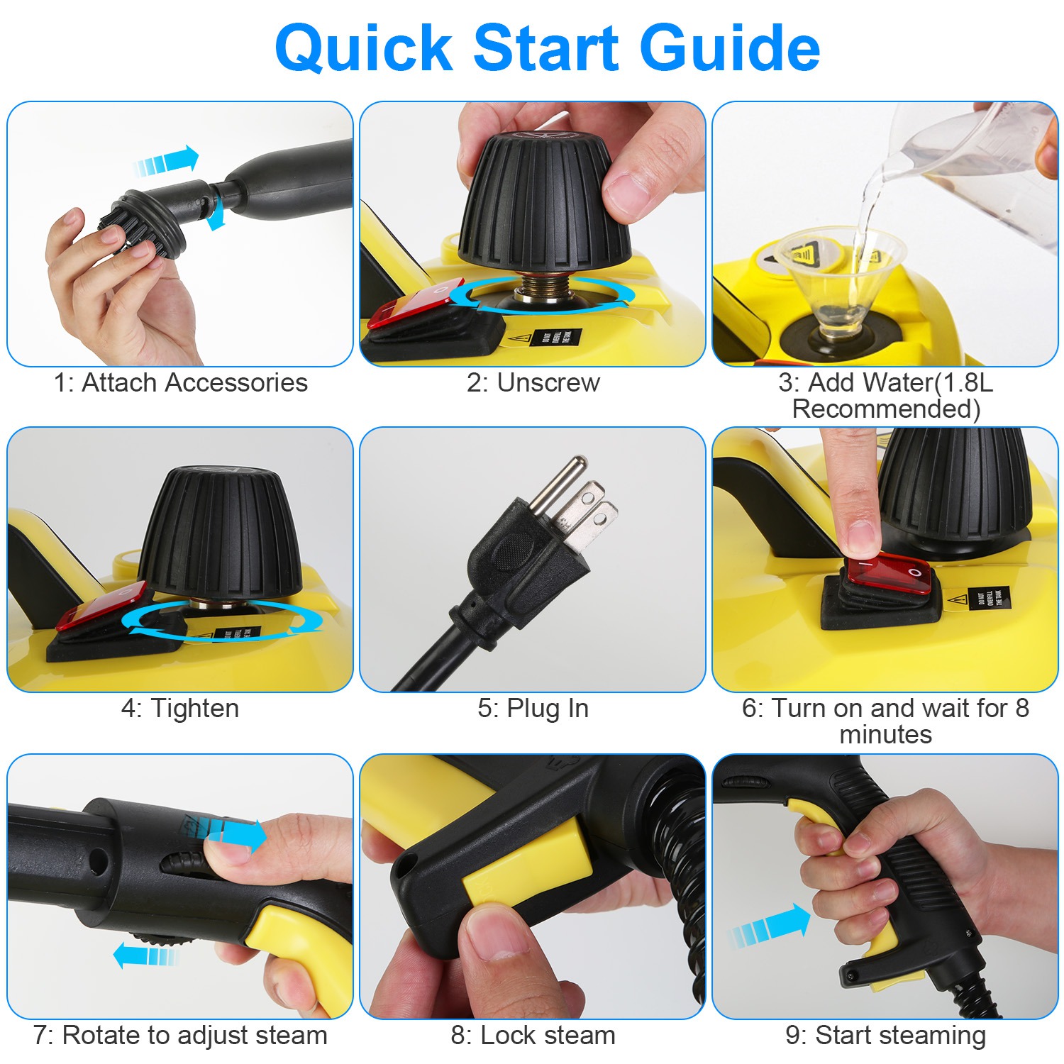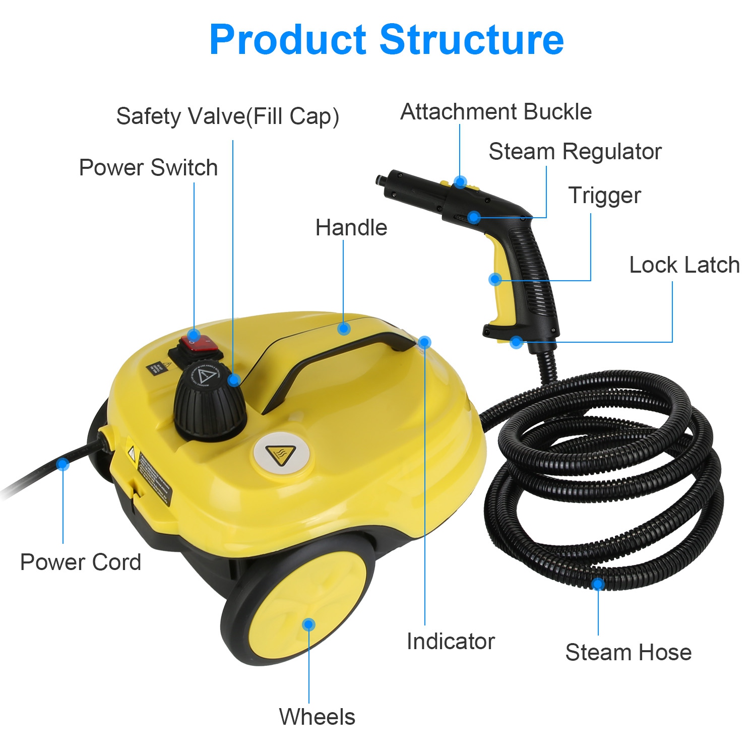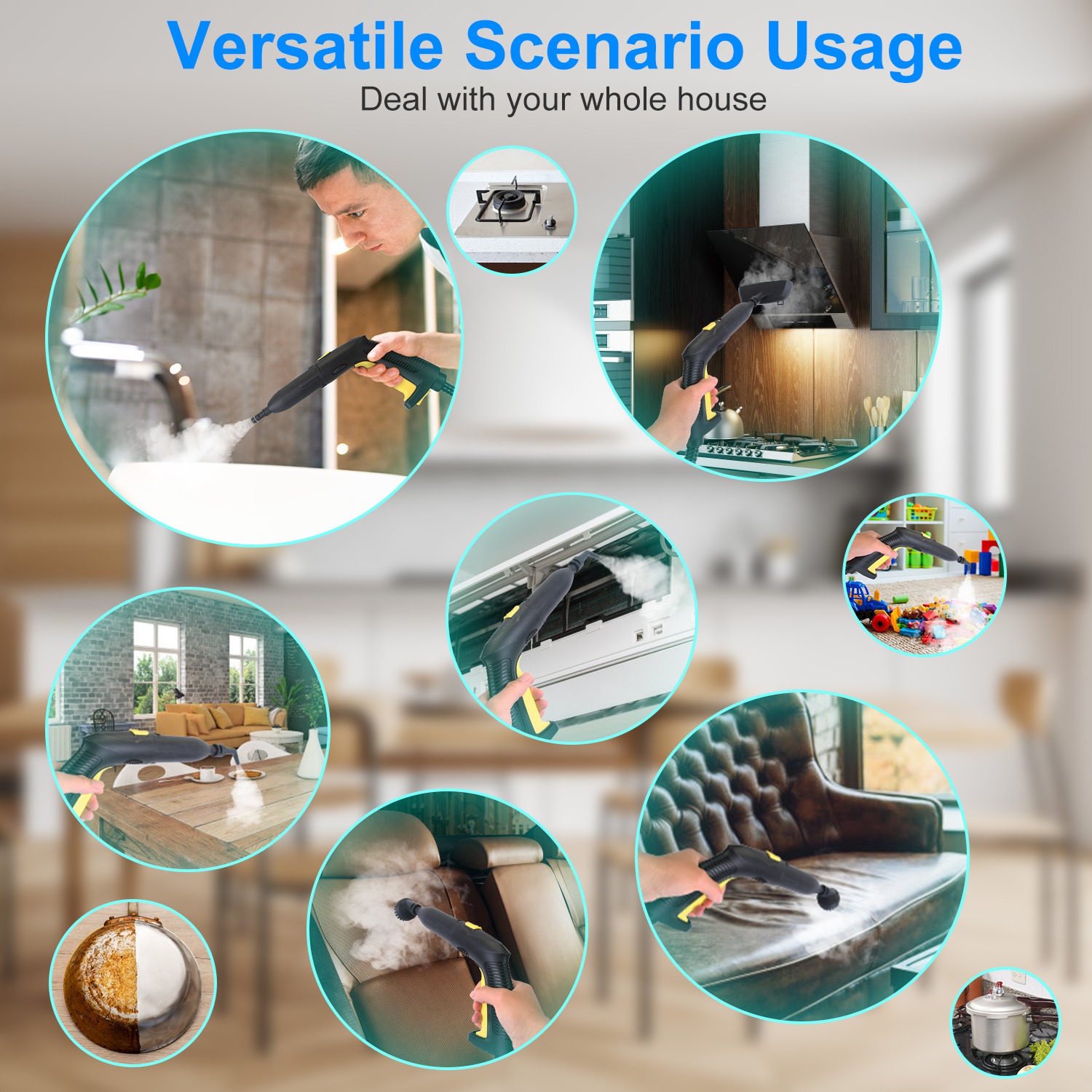 Powerful 1800W steam cleaner with 2L water tank, adjustable steam control, high temperature and pressure, and 15 versatile accessories with easy mobility.