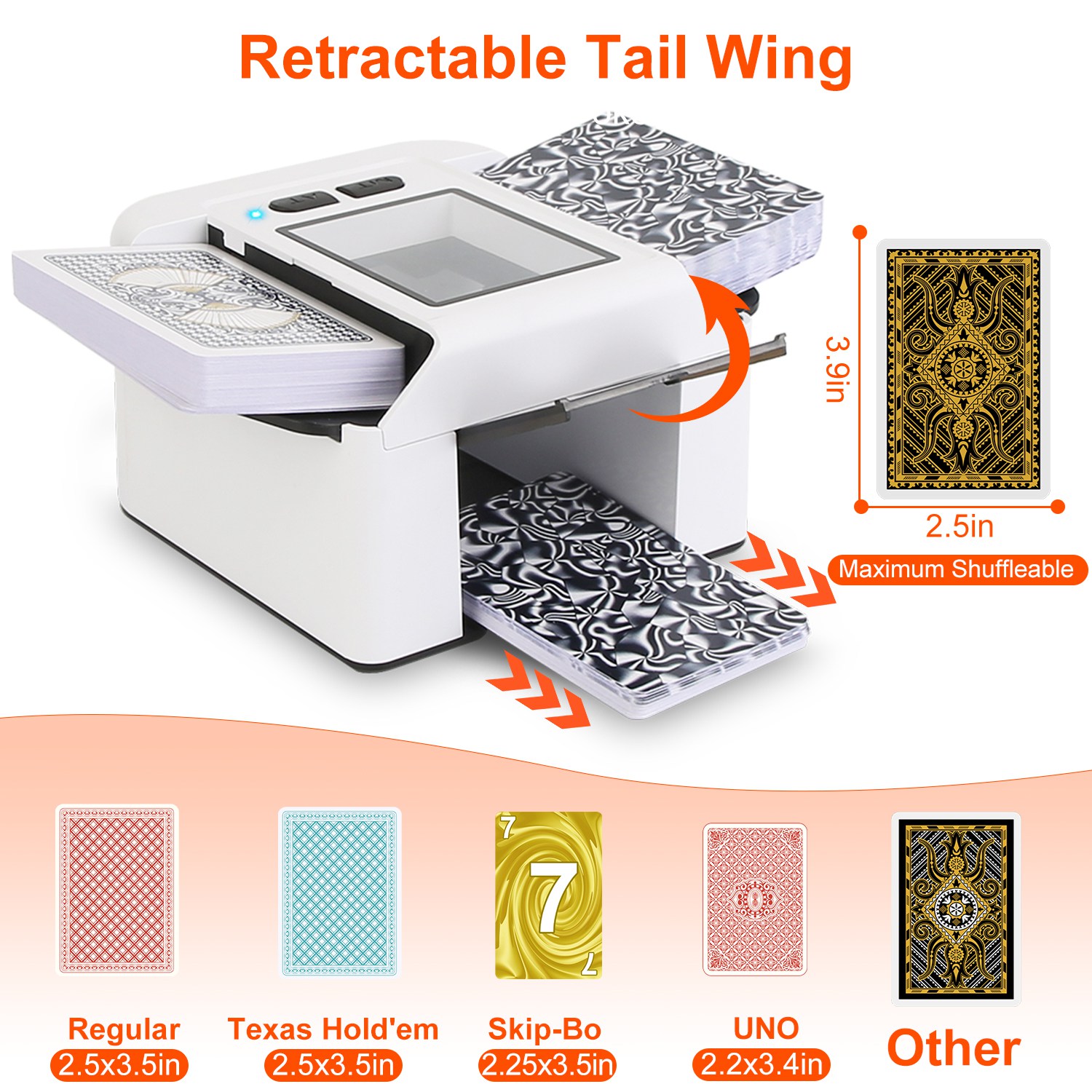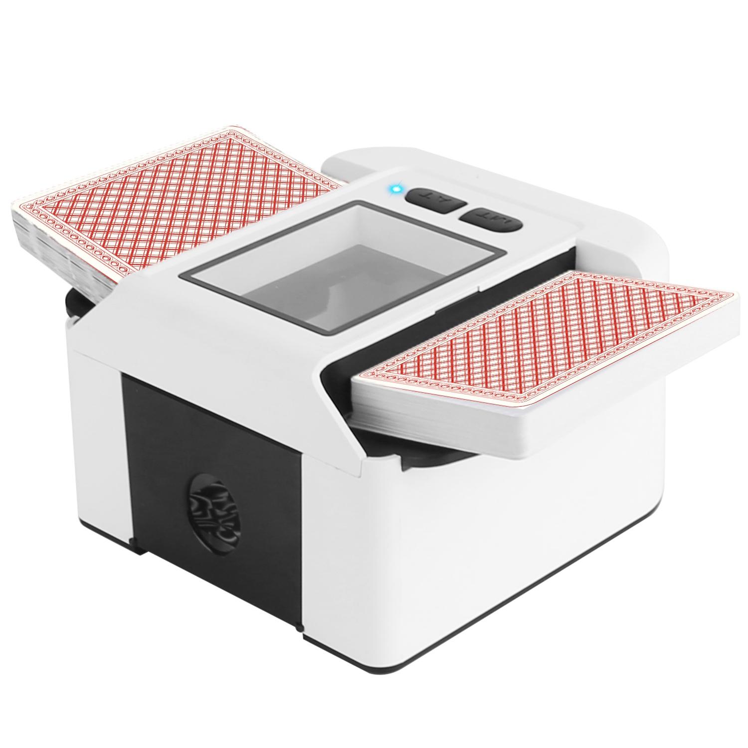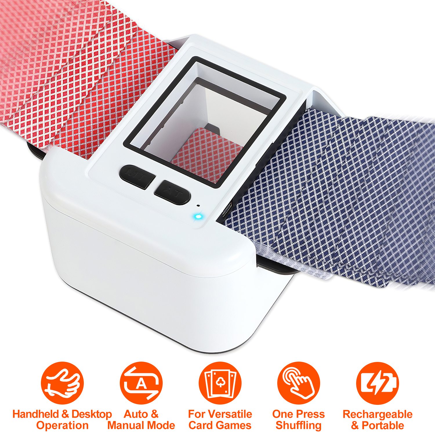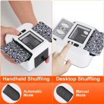 - *Auto & Manual Mode*: Equipped with 2 modes, this card shuffler caters to different user preferences and usage scenarios. You can either hold it in your hand or place it on the desktop for shuffling. The panoramic clear screen lets you see the shuffling process clearly, adding excitement to the game.