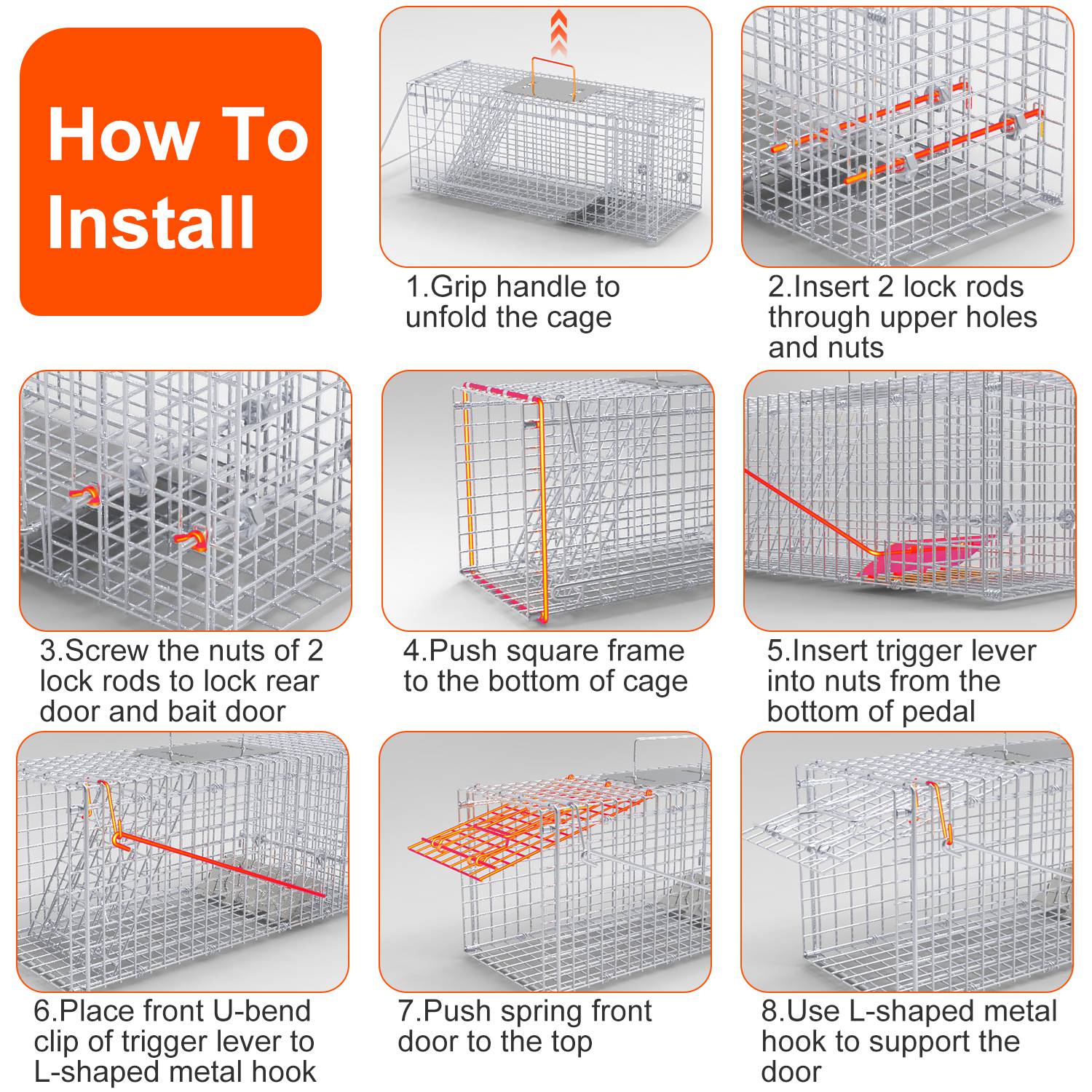 This 25.59-inch heavy-duty live animal trap cage is designed for humane, safe capture and release of small wildlife including rabbits, squirrels, possums, skunks, kittens, and raccoons. Constructed with robust folding wire mesh, it offers durability and ease of transport. The cage features a simple trigger mechanism that ensures reliable capture without harm to the animal. Ideal for pest control and wildlife management, it allows for efficient and ethical trapping of rodents and other small mammals. Its foldable design enhances portability and storage convenience, making it suitable for varied trapping applications.