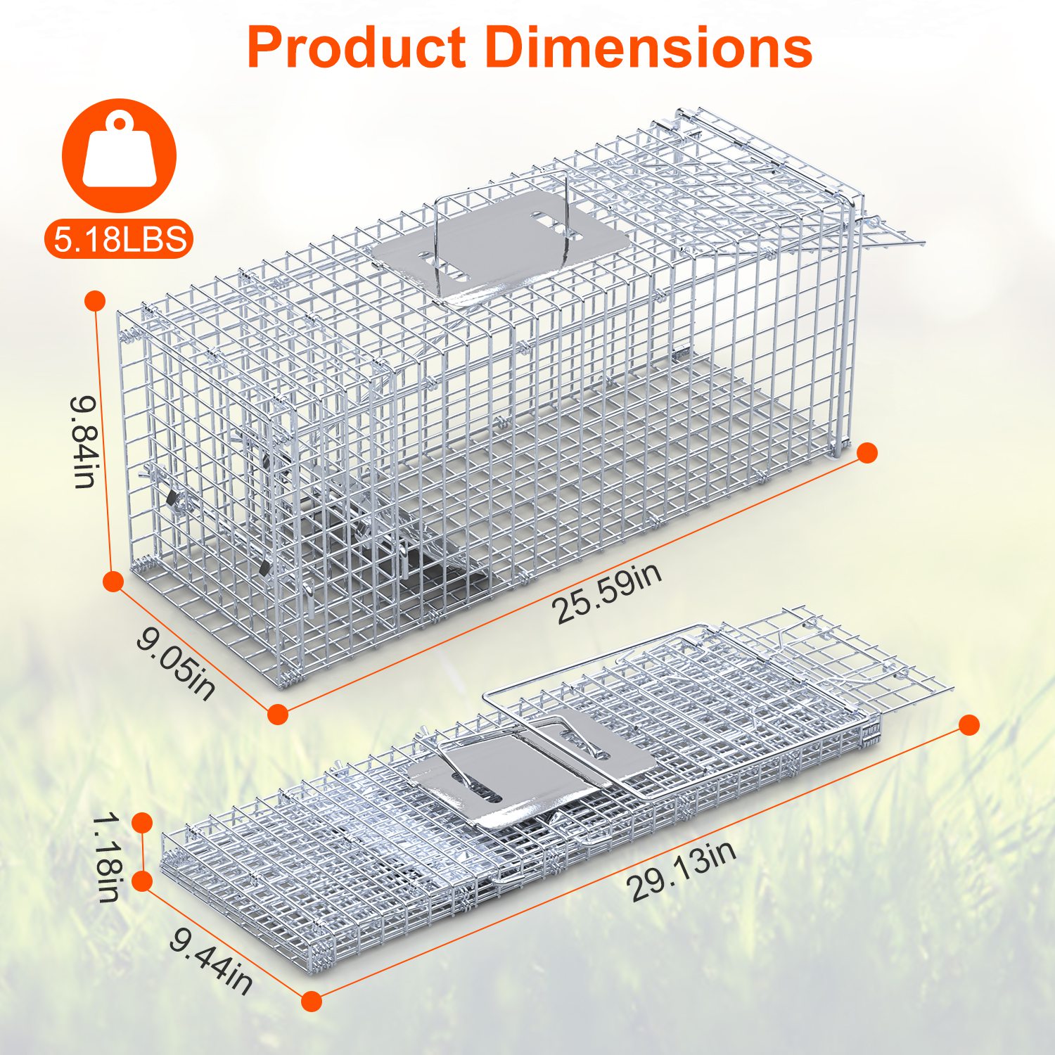 Durable 25.59-inch folding humane live animal trap cage designed for safely capturing rabbits, squirrels, possums, skunks, raccoons, and small animals.