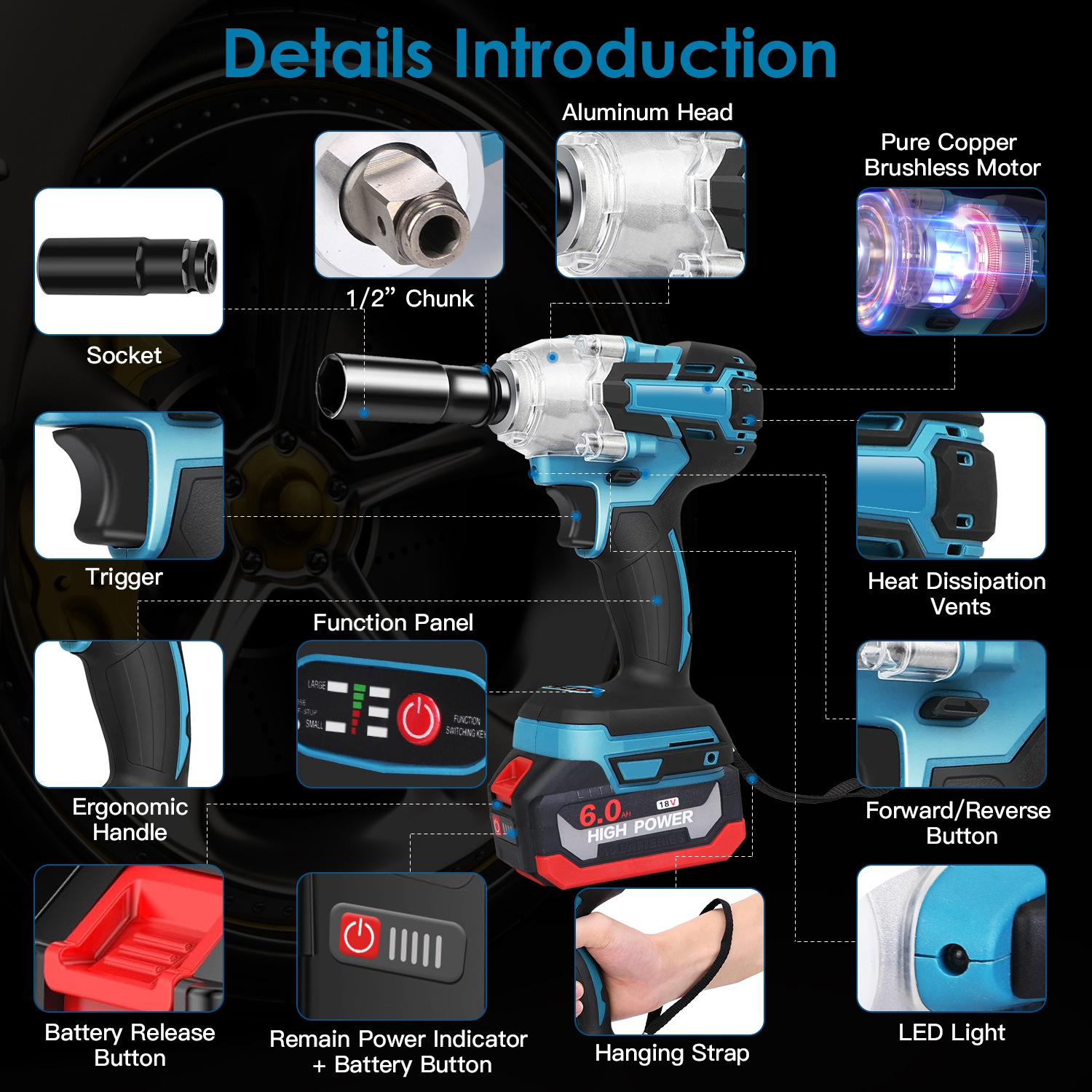 Powerful 3-in-1 cordless tool with brushless motor, variable speed up to 3450RPM, includes 2x 6.0Ah batteries, 3 sockets, screwdriver, and drill bits.