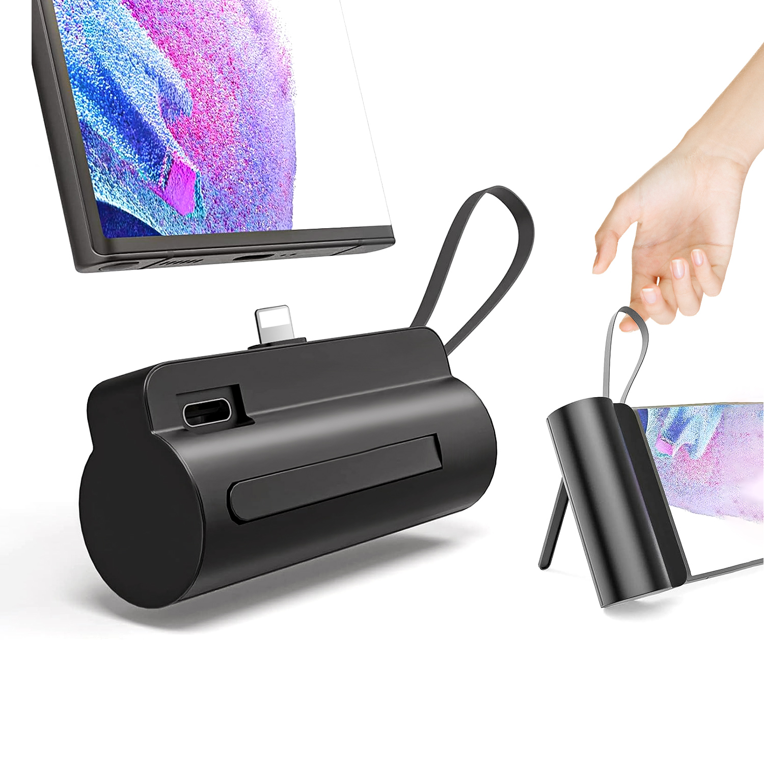 Compact 5000mAh portable charger with built-in Type-C and iOS cables, dual output, compatible with iOS devices for reliable mobile power.