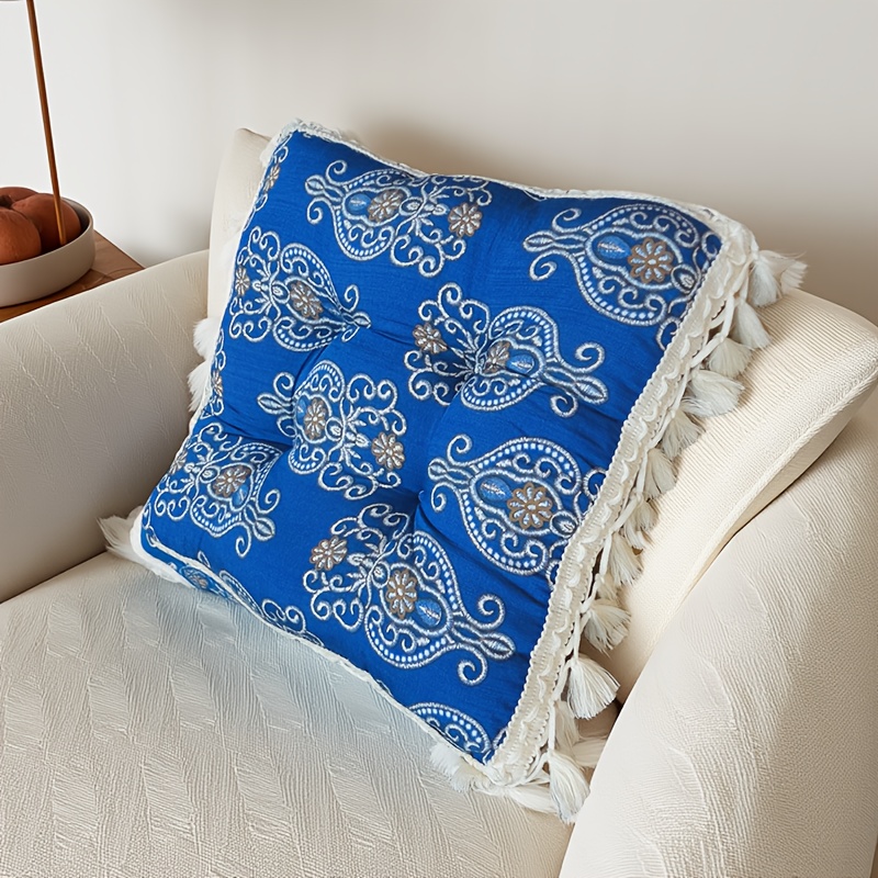 Elegant blue floral boho tassel cushion with fringe detailing, ideal for chairs, sofas, and various interiors providing comfortable support.