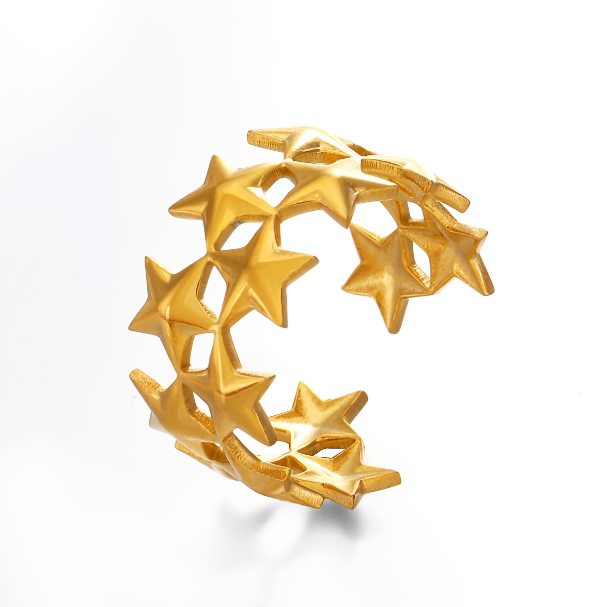 Elegant double-layer star open-end ring in stainless steel with 18K gold plating. Adjustable, perfect for daily wear, parties, and gifting.