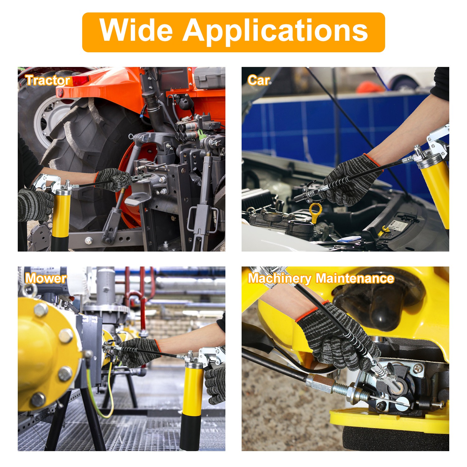 Durable grease gun kit with 14 oz tube, 7000 PSI pressure, pistol grip, lock coupler, and flexible 11-inch hose for efficient lubrication.