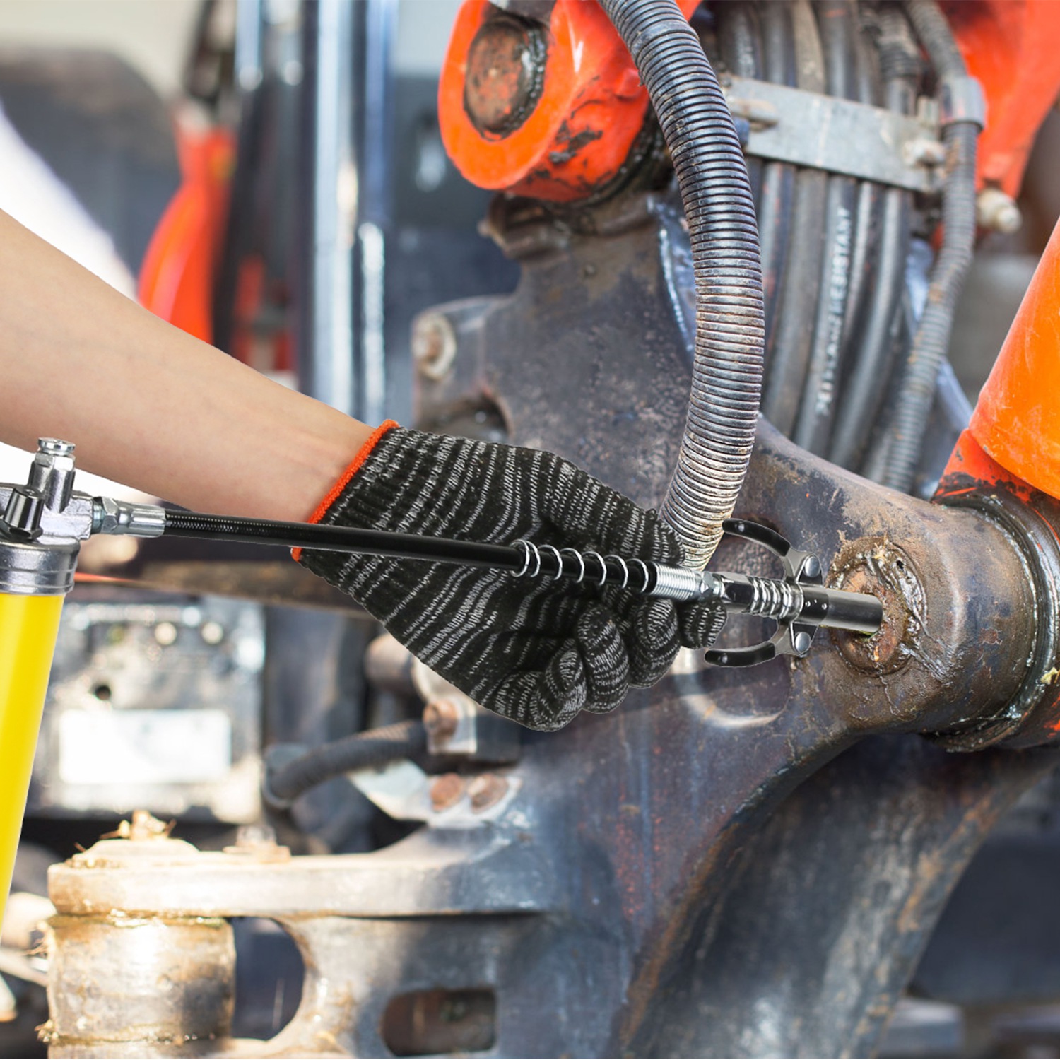 This 1-piece grease gun kit is designed to accommodate a 14-ounce grease tube, delivering up to 7000 PSI of high pressure for effective lubrication. Featuring an ergonomic pistol grip for comfortable handling, it includes a lock coupler to ensure secure connections during use. The assembly is equipped with an 11-inch spring flex hose that enhances maneuverability and access to tight spaces. Additionally, sharp nozzle jaws provide precise application of grease, enhancing efficiency and reducing waste. Constructed for durability, this grease gun kit is suitable for various mechanical maintenance tasks requiring reliable grease delivery.