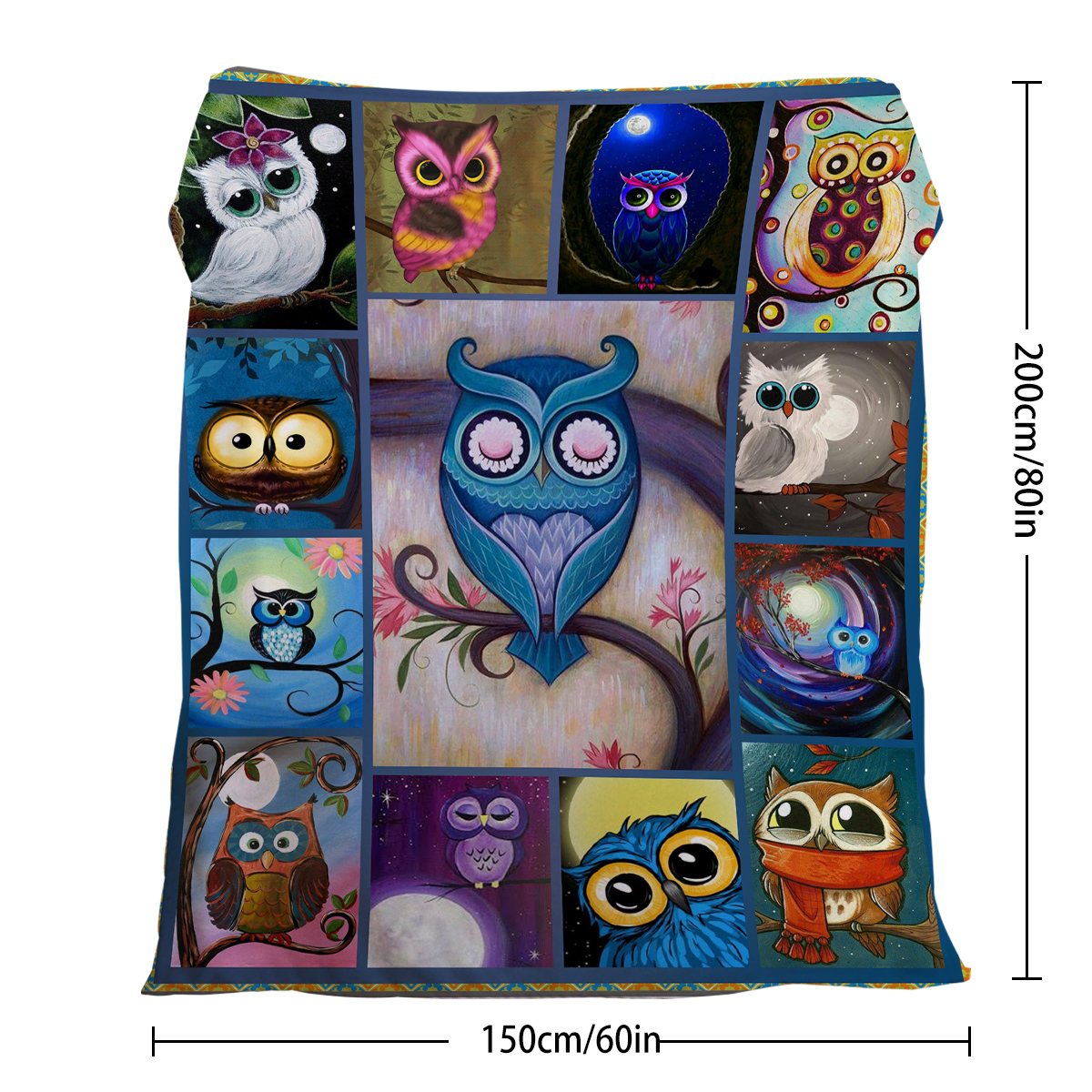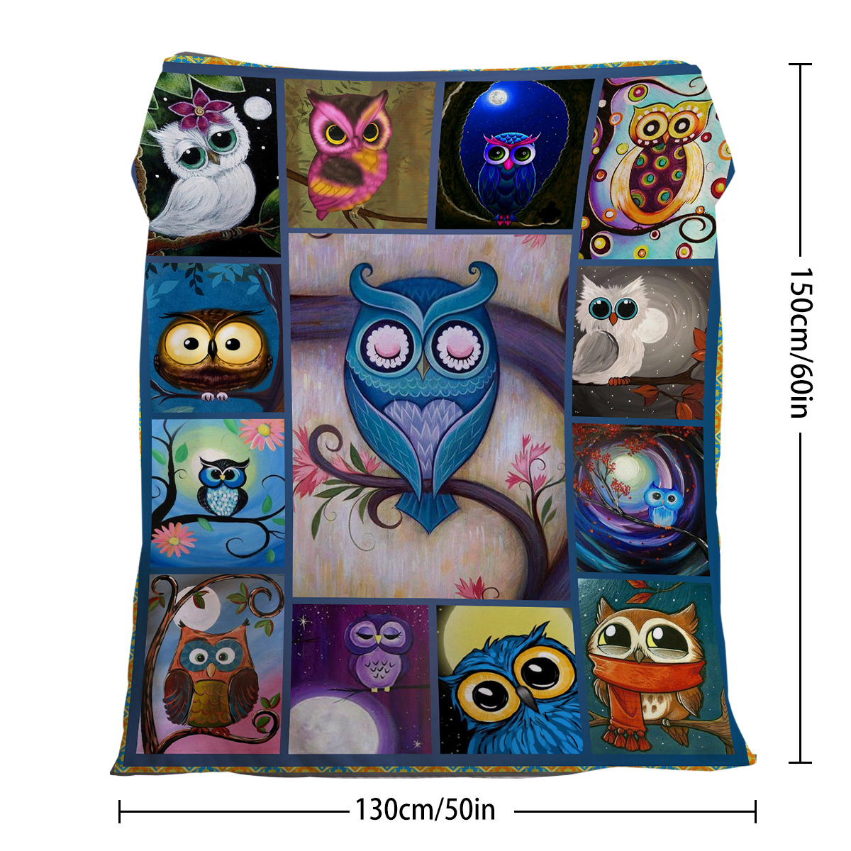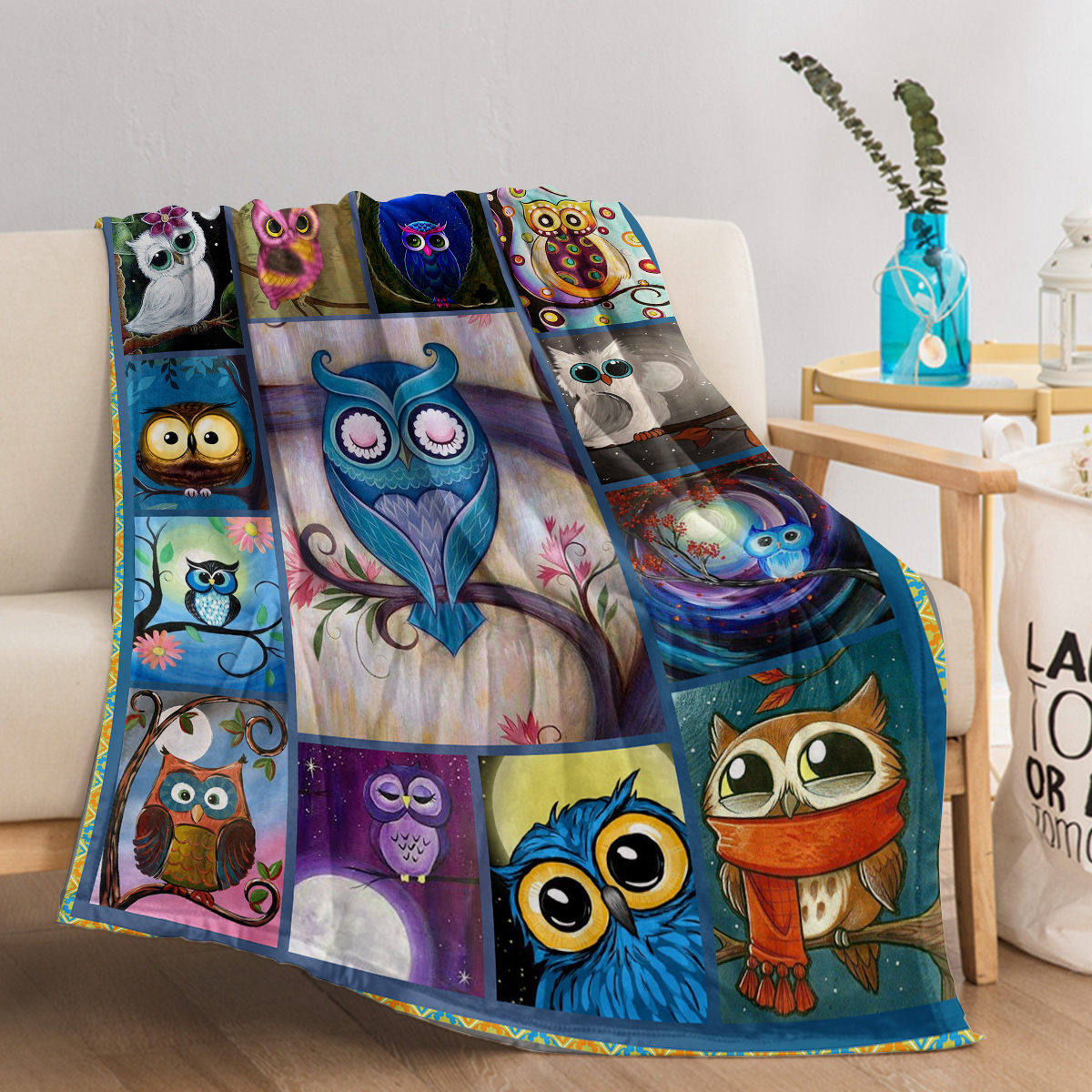 Soft, fluffy flannel blanket with owl print, ideal for outdoor, beach, camping, sofa, office, and nap use.
