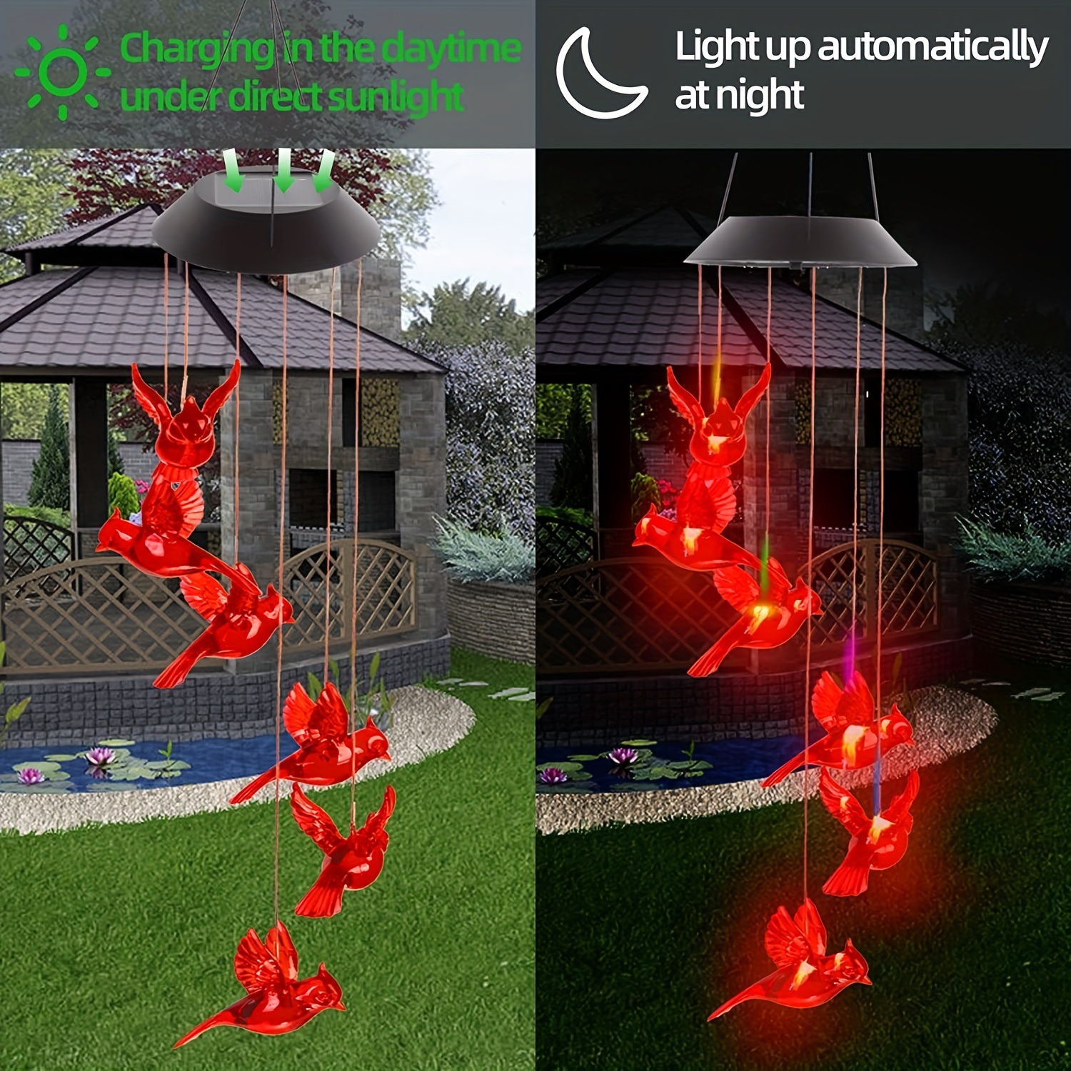 This outdoor solar wind chime features a flaming bird design that adds a vibrant decorative element to gardens, patios, and outdoor spaces. Equipped with solar-powered LED lights, it charges during the day and illuminates with colorful lighting at night, enhancing the ambiance with a charming glow. Crafted from durable materials suited for outdoor use, this wind chime combines aesthetic appeal with functionality. It provides a soothing sound as it gently sways in the breeze, while the solar lighting ensures energy-efficient performance without wiring requirements.