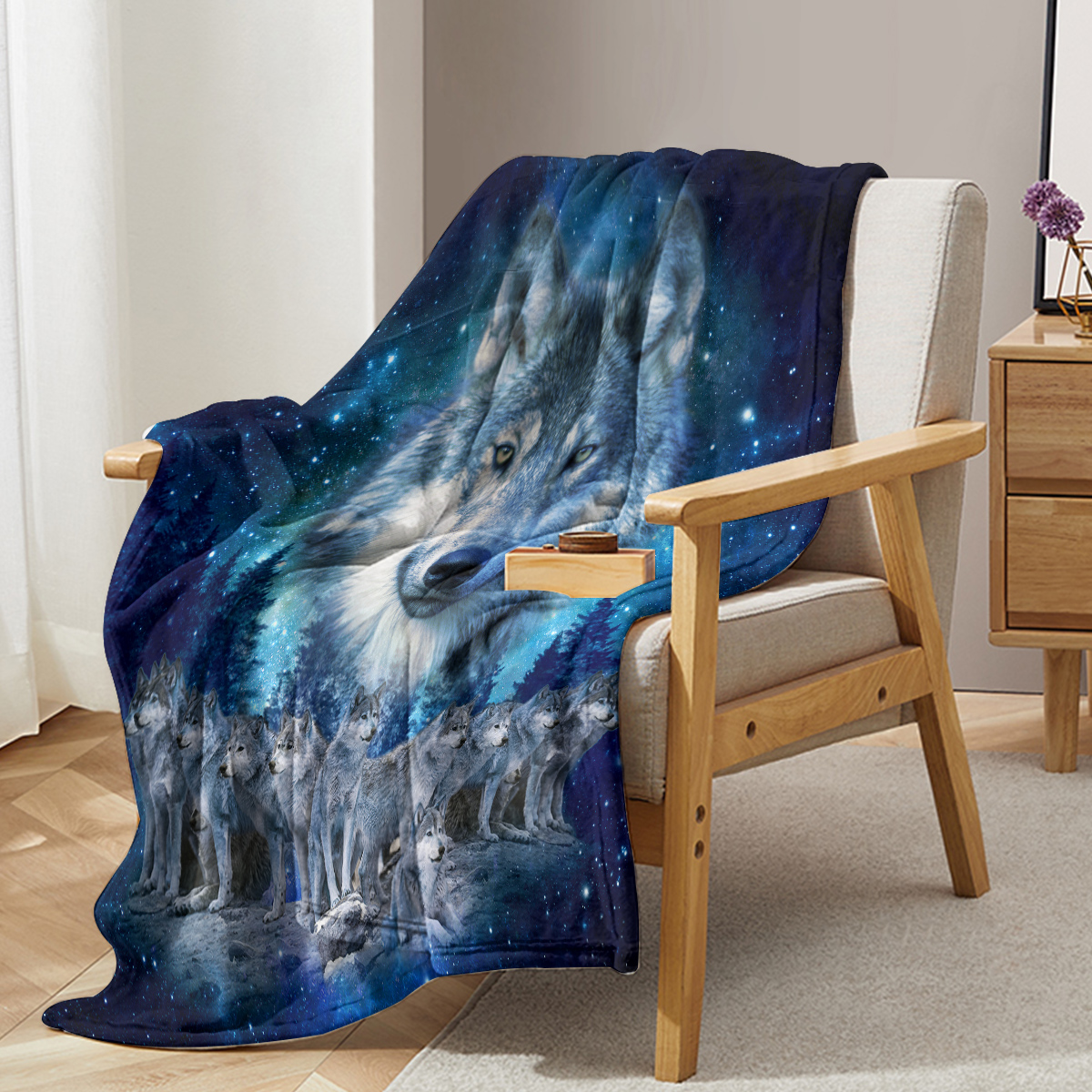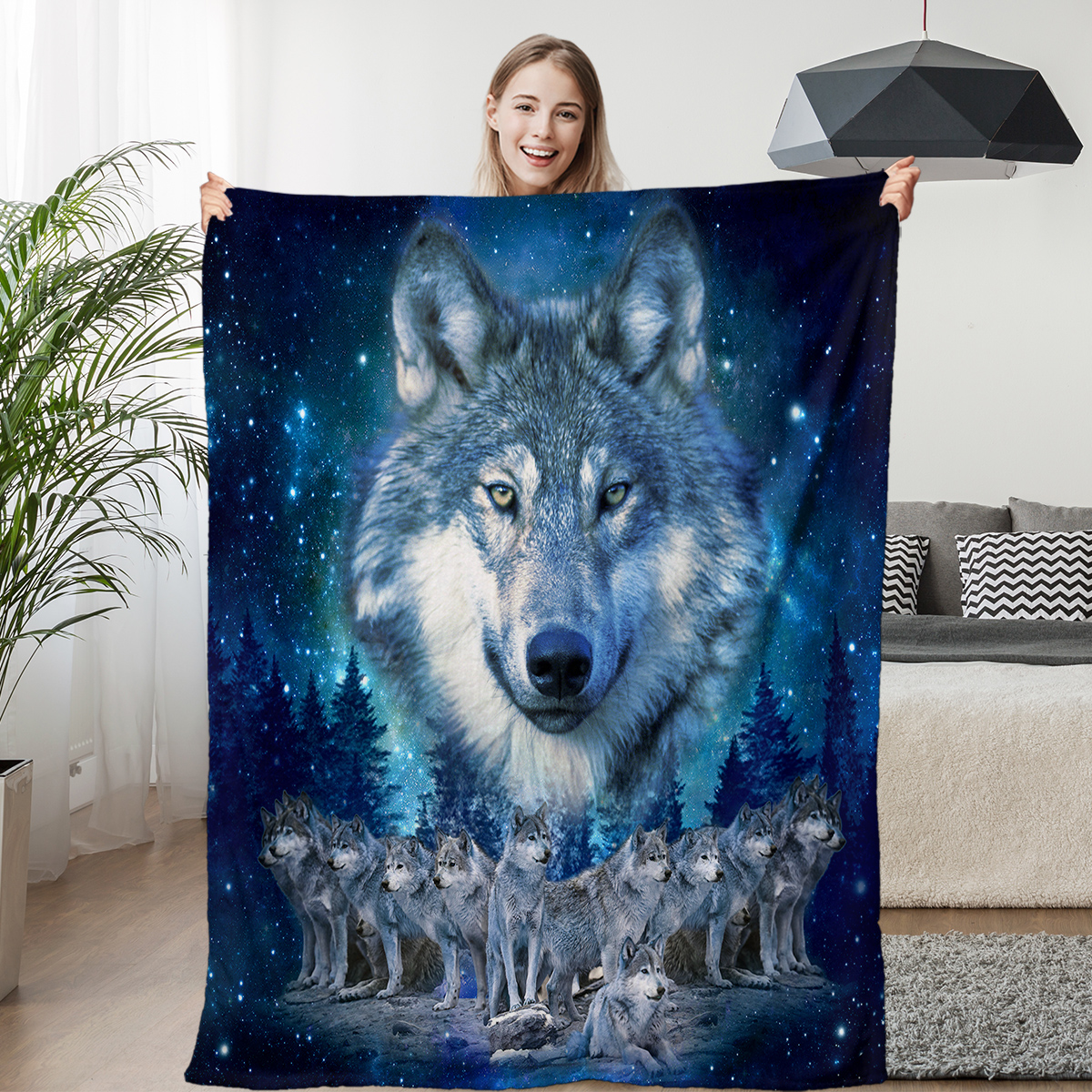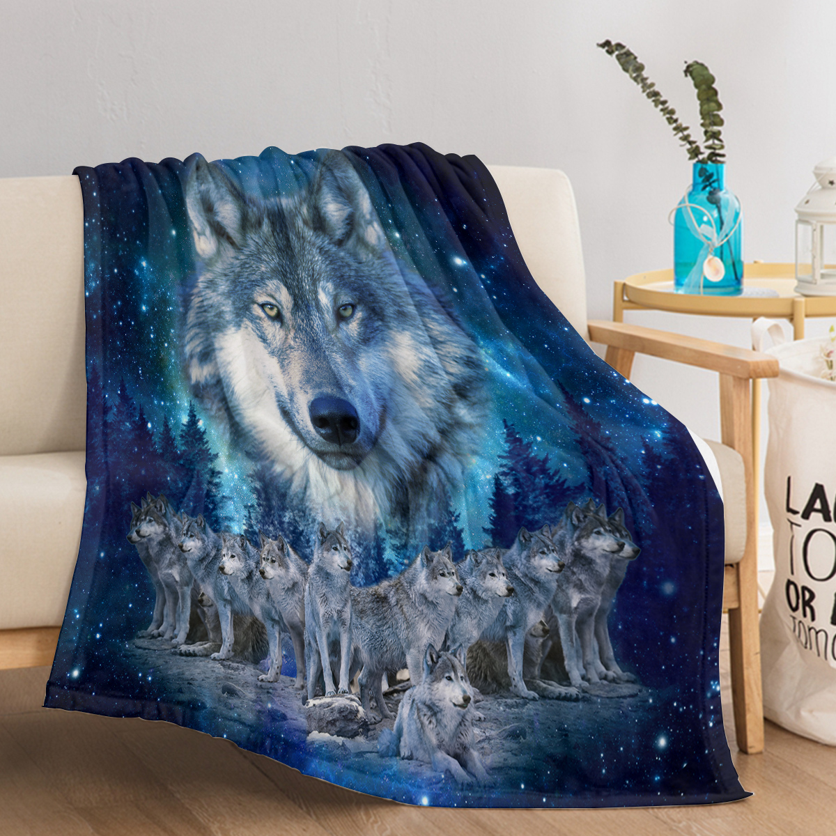 Soft flannel sofa blanket featuring starry wolf pack design, ideal for bed, sofa, camping, and versatile seasonal use.