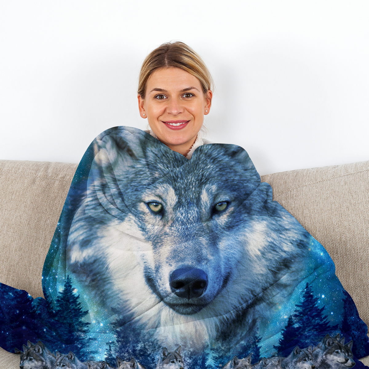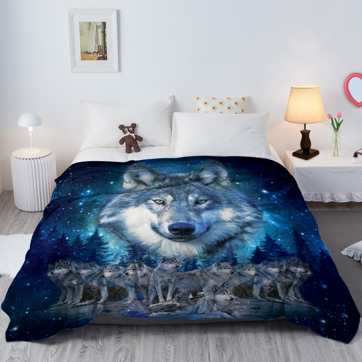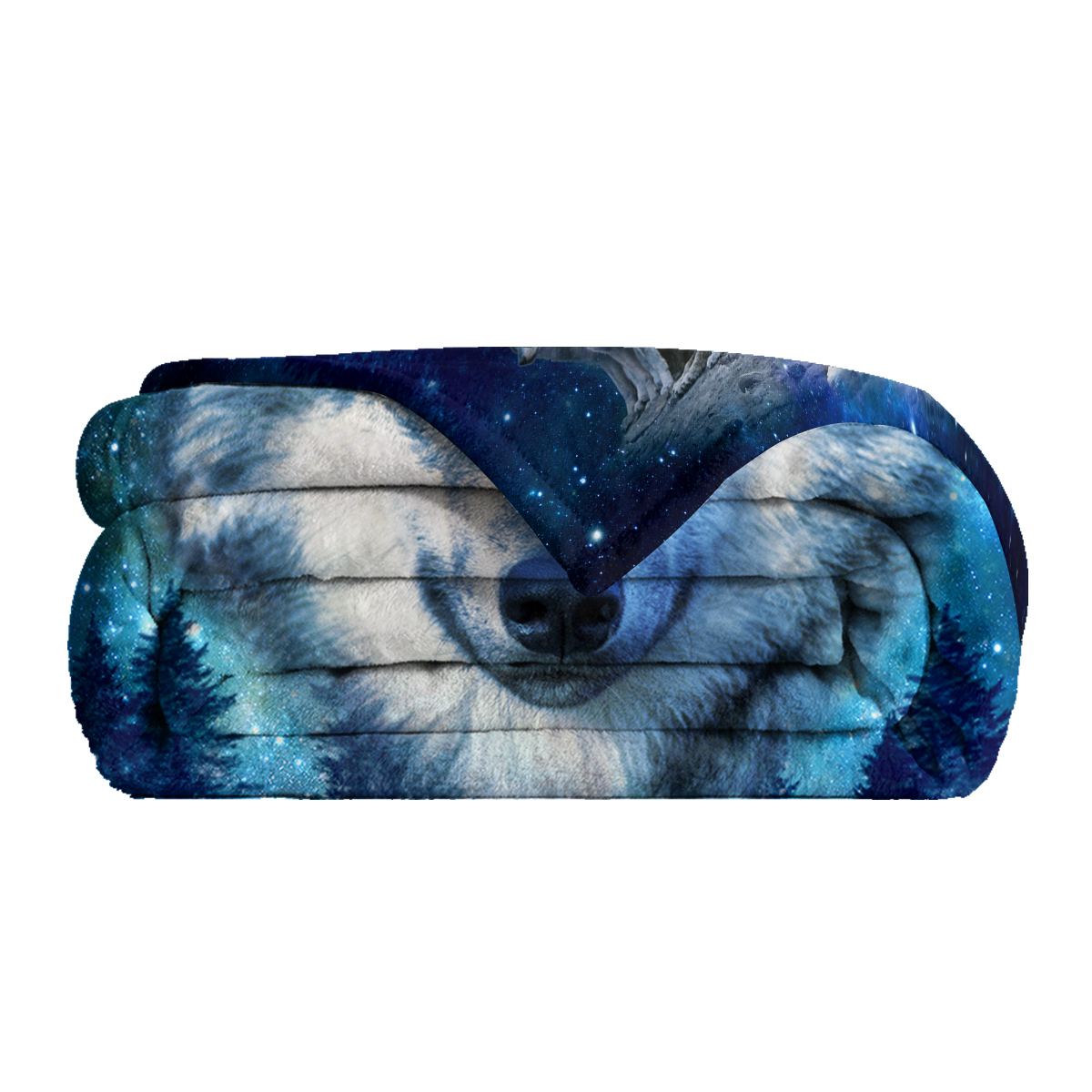 Soft flannel sofa blanket featuring starry wolf pack design, ideal for bed, sofa, camping, and versatile seasonal use.