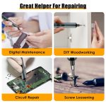 This comprehensive 70-in-1 mini electric screwdriver kit features a rechargeable 3.7V battery and offers five adjustable torque settings for precise control. Equipped with 64 high-quality S2 steel precision bits, it covers a wide range of repair tasks for phones, cameras, laptops, and watches. The kit includes four built-in LED lights to illuminate work areas, enhancing accuracy during use. Its compact design and magnetic bit holder ensure convenience and efficiency for detailed electronic repairs.
