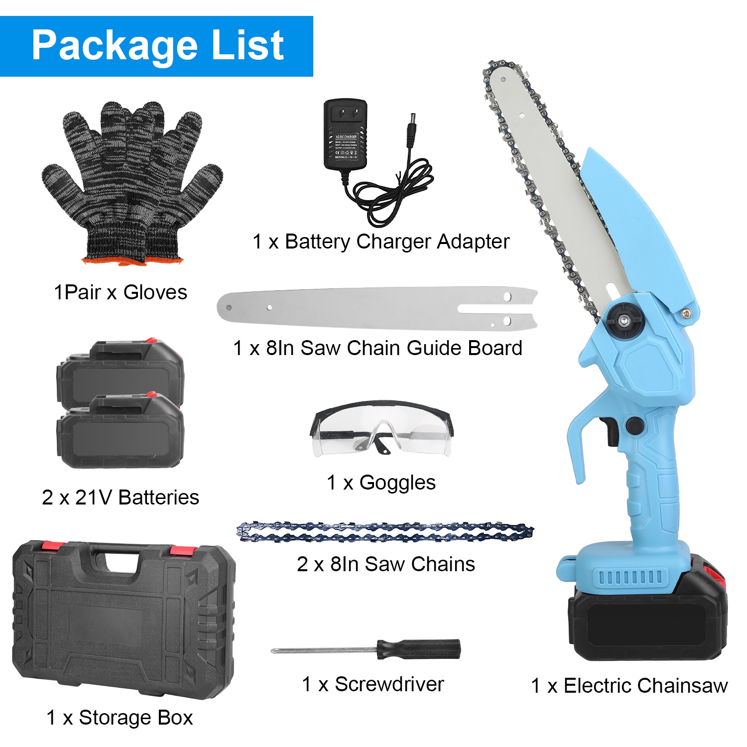 This portable electric mini chainsaw features an 8-inch cutting blade and operates cordless for enhanced mobility and convenience. Equipped with two high-capacity 1200mAh rechargeable batteries, it ensures extended usage time suitable for pruning trees and cutting wood efficiently. The set includes protective gloves and goggles, providing essential safety for the user during operation. Designed for ease of use and portability, this handheld cordless chain saw is ideal for gardening, landscaping, and general wood cutting tasks.