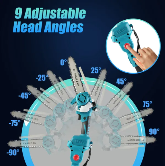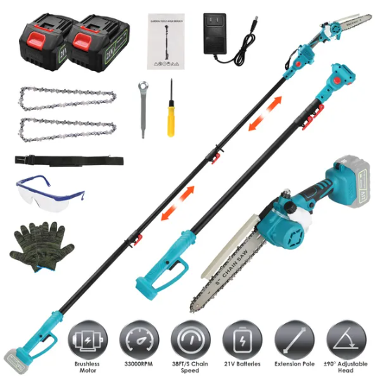 This 2-IN-1 cordless pole saw and mini chainsaw features a robust 21V brushless motor and an 8-foot extendable pole for versatile tree trimming applications. Equipped with an automatic oiler, it ensures smooth chain operation, while the integrated safety switch enhances user protection. Weighing only 6.4 pounds, the lightweight design reduces operator fatigue during prolonged use. The cordless configuration offers enhanced mobility, making it ideal for pruning branches and cutting with precision. Durable construction and ergonomic handling combine to provide an efficient and convenient tool for maintaining trees and shrubs.