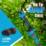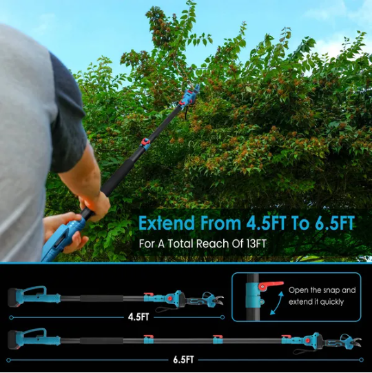 This 2-in-1 cordless electric pruning shear features a powerful 21V 4.0Ah battery, offering extended runtime and efficient cutting performance. Equipped with an extendable pole reaching up to 13 feet, it allows safe and convenient trimming of high branches without the need for ladders. The pruner supports cutting diameters up to 0.98 inches, making it suitable for various tree trimming tasks. Its ergonomic design ensures comfortable handling while the cordless operation provides maximum mobility. Ideal for garden and orchard maintenance, this electric shear combines precision cutting with extended reach for versatile and effective pruning.