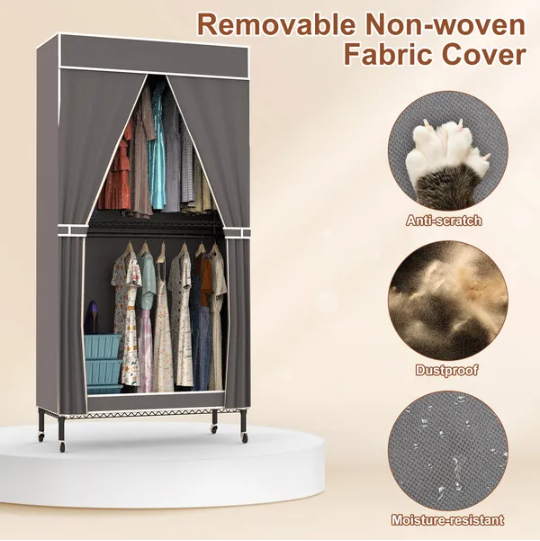 This 2-tier clothing rack features a sturdy cover and a portable design for convenient garment storage. Equipped with four smooth-rolling wheels, it ensures easy mobility. The rack includes two hanging rods for ample hanging space and two side hook racks for additional storage options. Measuring 35.43 inches in length, 17.13 inches in width, and 72.44 inches in height, it optimizes space while protecting clothing with its secure cover. Ideal for organizing wardrobes, this garment rack combines functionality with mobility.