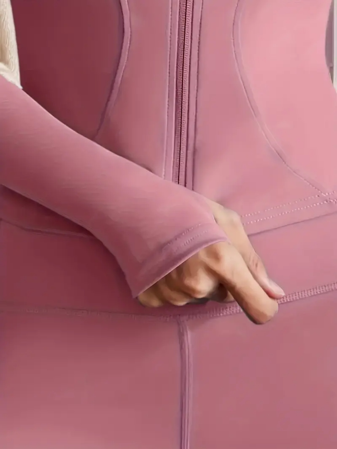 All-season 2025 women’s fitness running suit featuring a long-sleeved sports jacket and form-fitting hip pants for optimal performance.