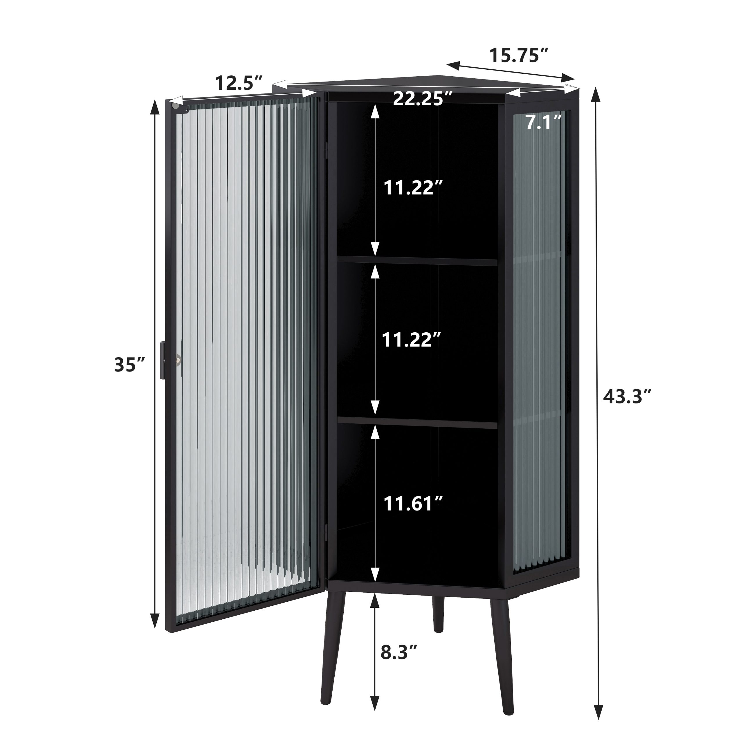 Black 22.25” floor corner cabinet featuring tempered glass doors and three-tier storage, ideal for bathroom, living room, or bedroom organization.