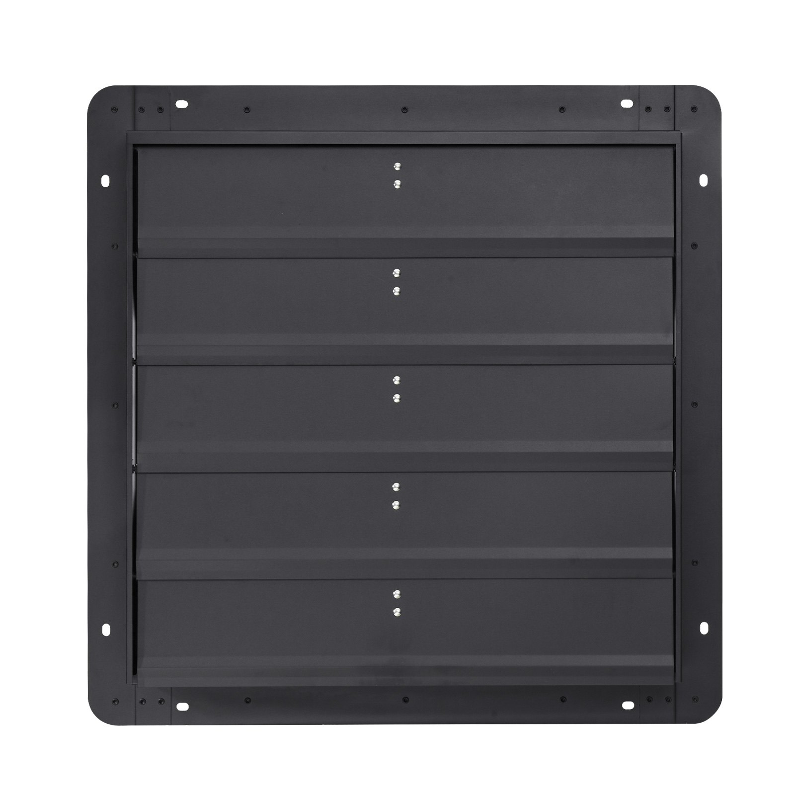 This 24 inch shutter exhaust fan is designed for wall mounting, ideal for attic, shed, garage, and greenhouse ventilation. It features a smart programming system with variable speed and temperature control to optimize airflow based on environmental conditions. Powered by an energy-efficient EC motor, the fan delivers up to 2900 CFM for effective cooling and ventilation. The integrated timer allows for scheduled operation, enhancing convenience and energy savings. The durable black finish ensures long-lasting performance in various settings, providing reliable air circulation and temperature regulation where needed.