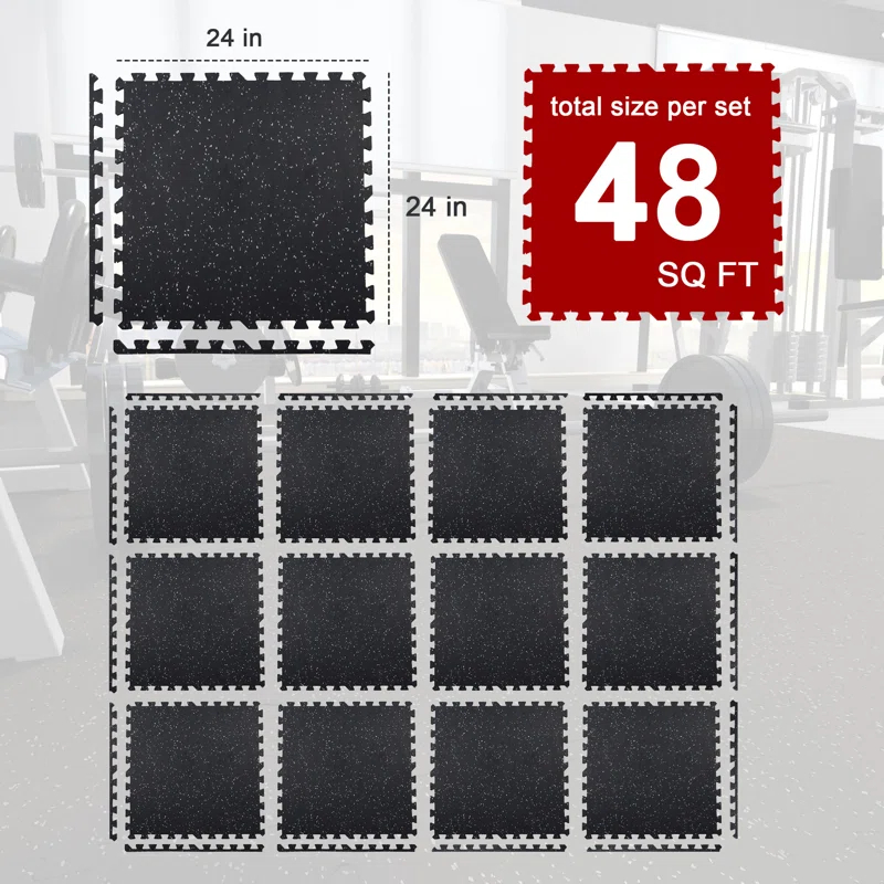 Durable 24×24 inch EVA foam interlocking tiles for gym and exercise flooring, covering 48 sq ft with 12 easy-install tiles.